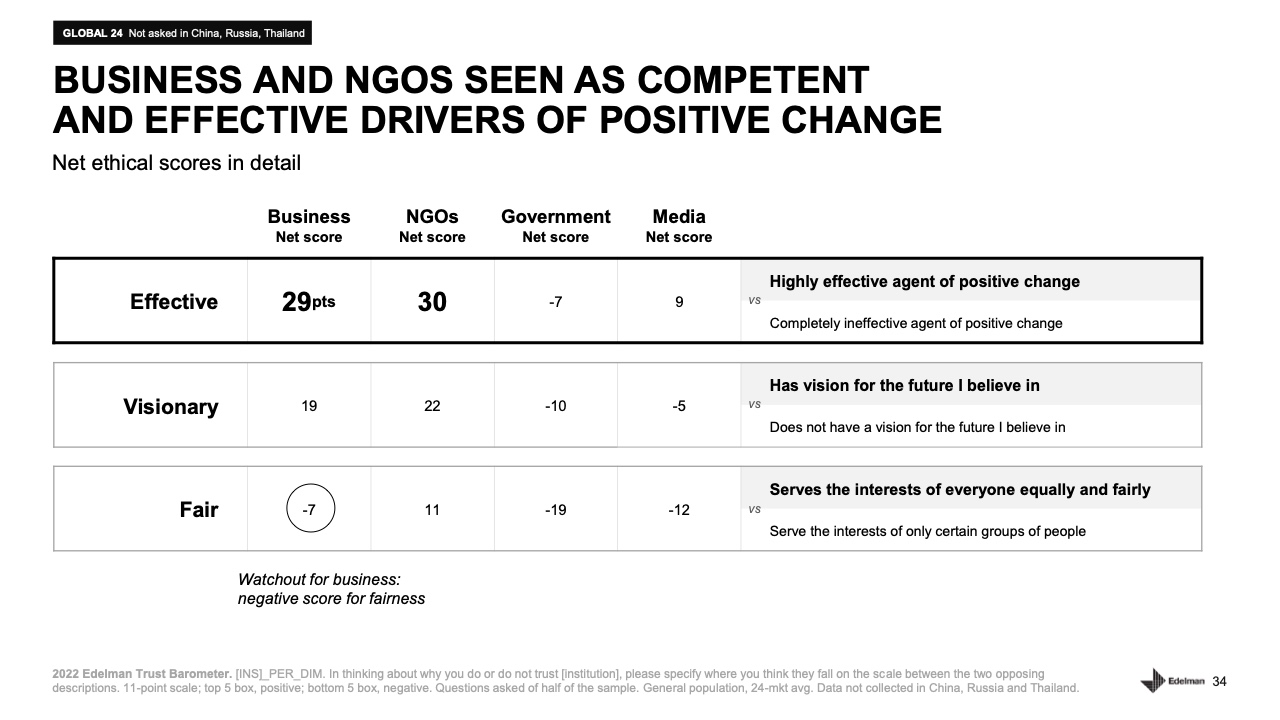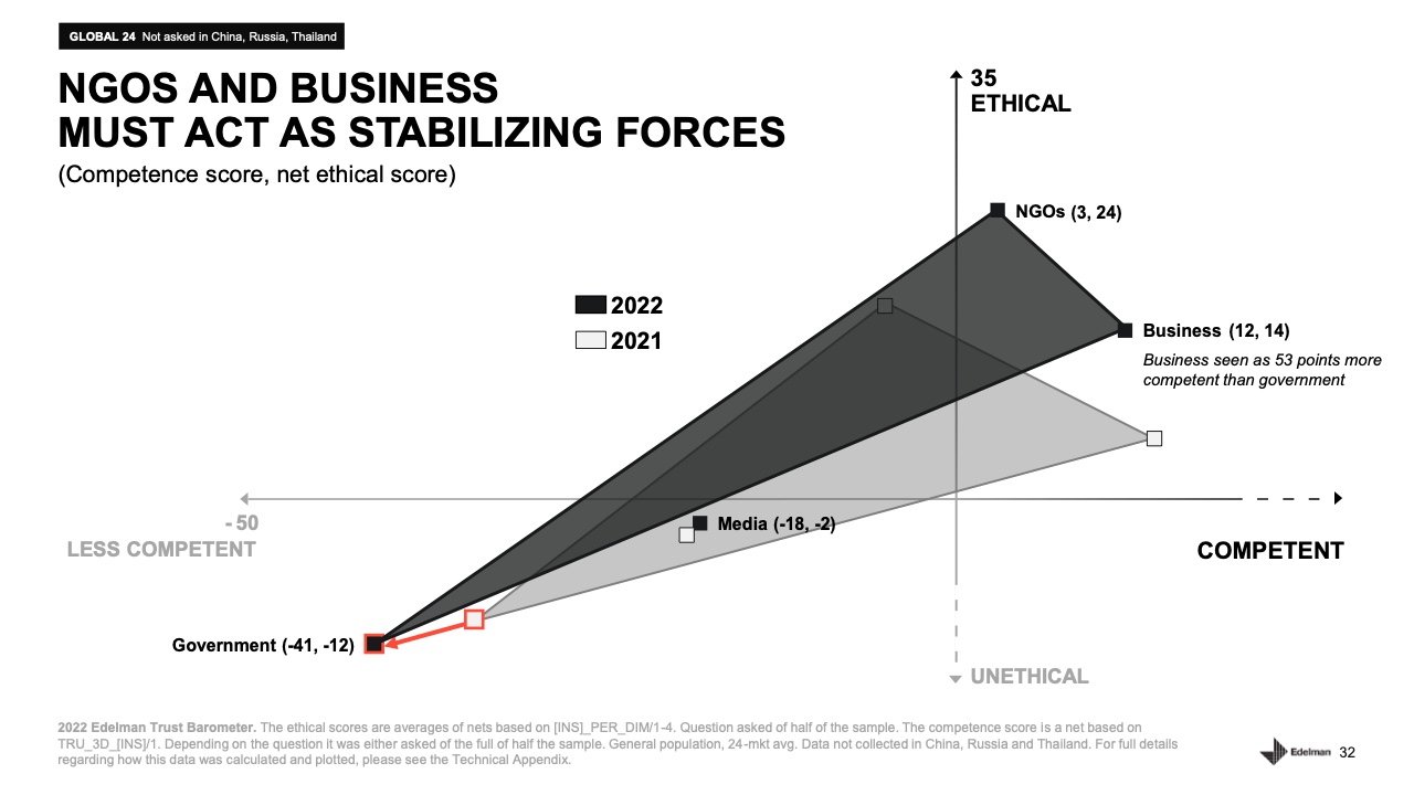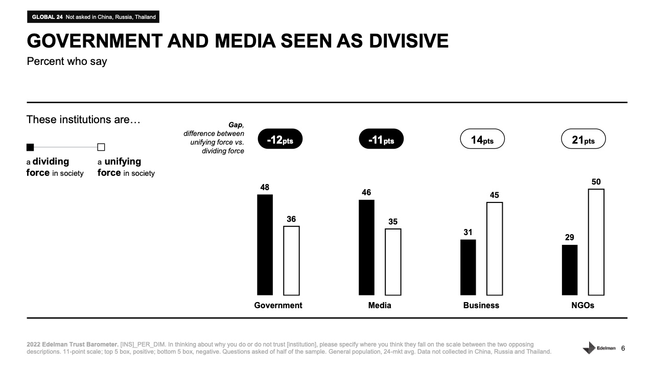 中国和美国在这次调查产生了天壤之别的结果,中国在各个方面全面碾压美国。中国整体信任指数83,政府信任指数91,其次是商业机构84,媒体80,非政府组织77。美国整体信任指数只有43,商业机构信任指数49,其次是非政府组织45,政府39,媒体39.