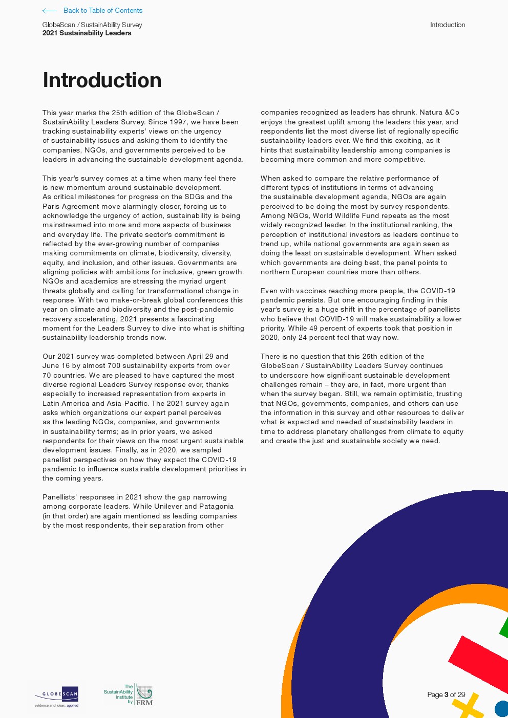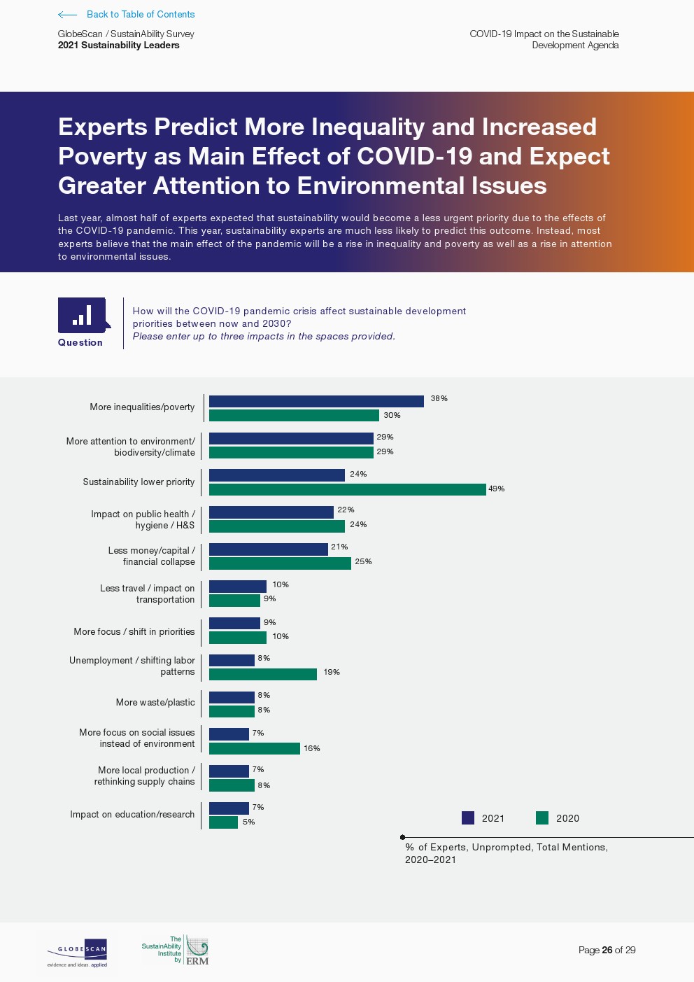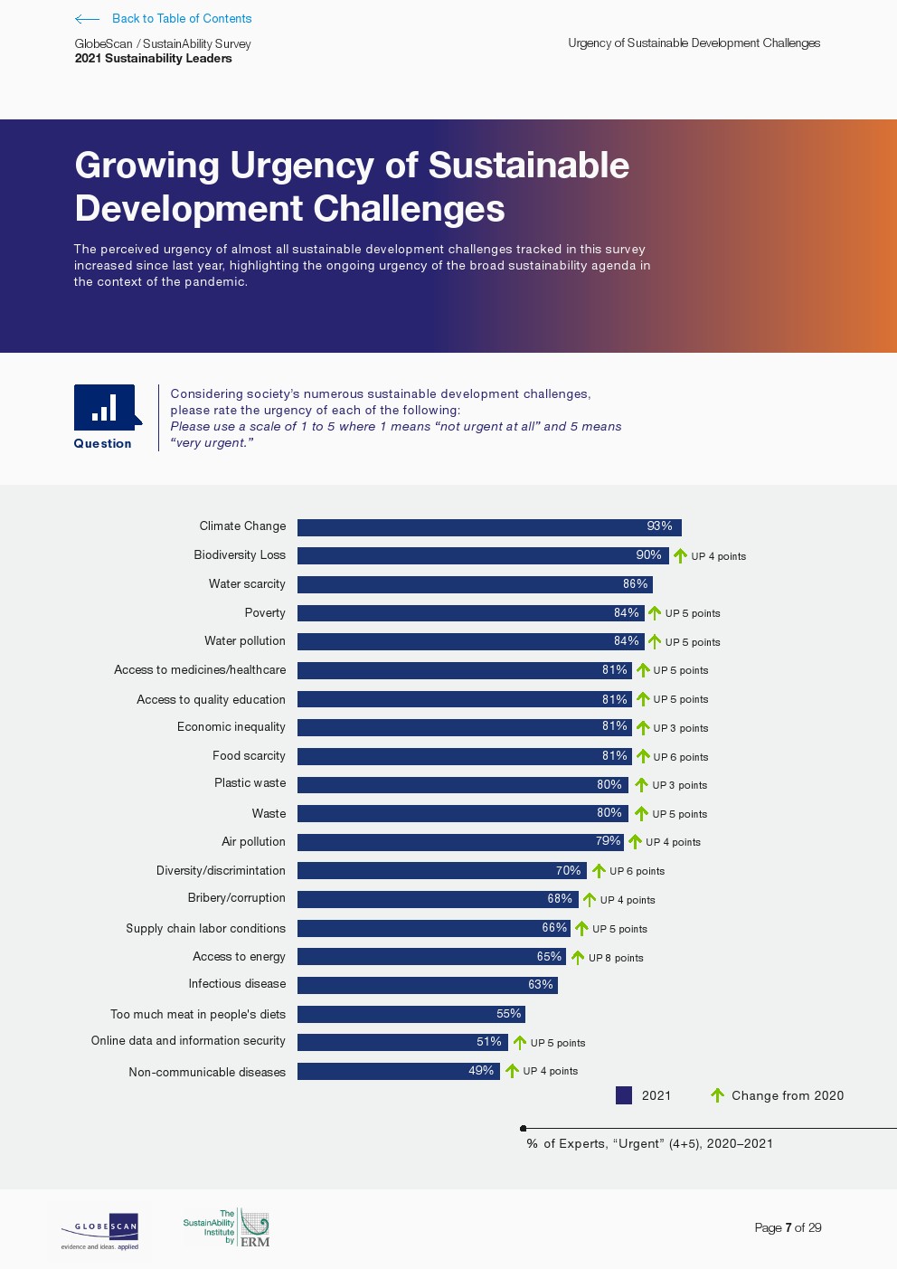 GlobeScan发布了“2021年可持续发展领先者报告”,对几乎所有可持续性挑战的担忧持续加剧。专家连续第二年将大多数问题评为越来越紧迫。虽然对气候变化的关注保持稳定,但它继续被视为最紧迫的问题。其他在过去五年中排名靠前并被视为日益紧迫的问题包括生物多样性丧失、水资源短缺、贫困和水污染。在过去一年,人们认为紧迫感增加最多的问题包括获得能源、粮食安全以及多样性和歧视。