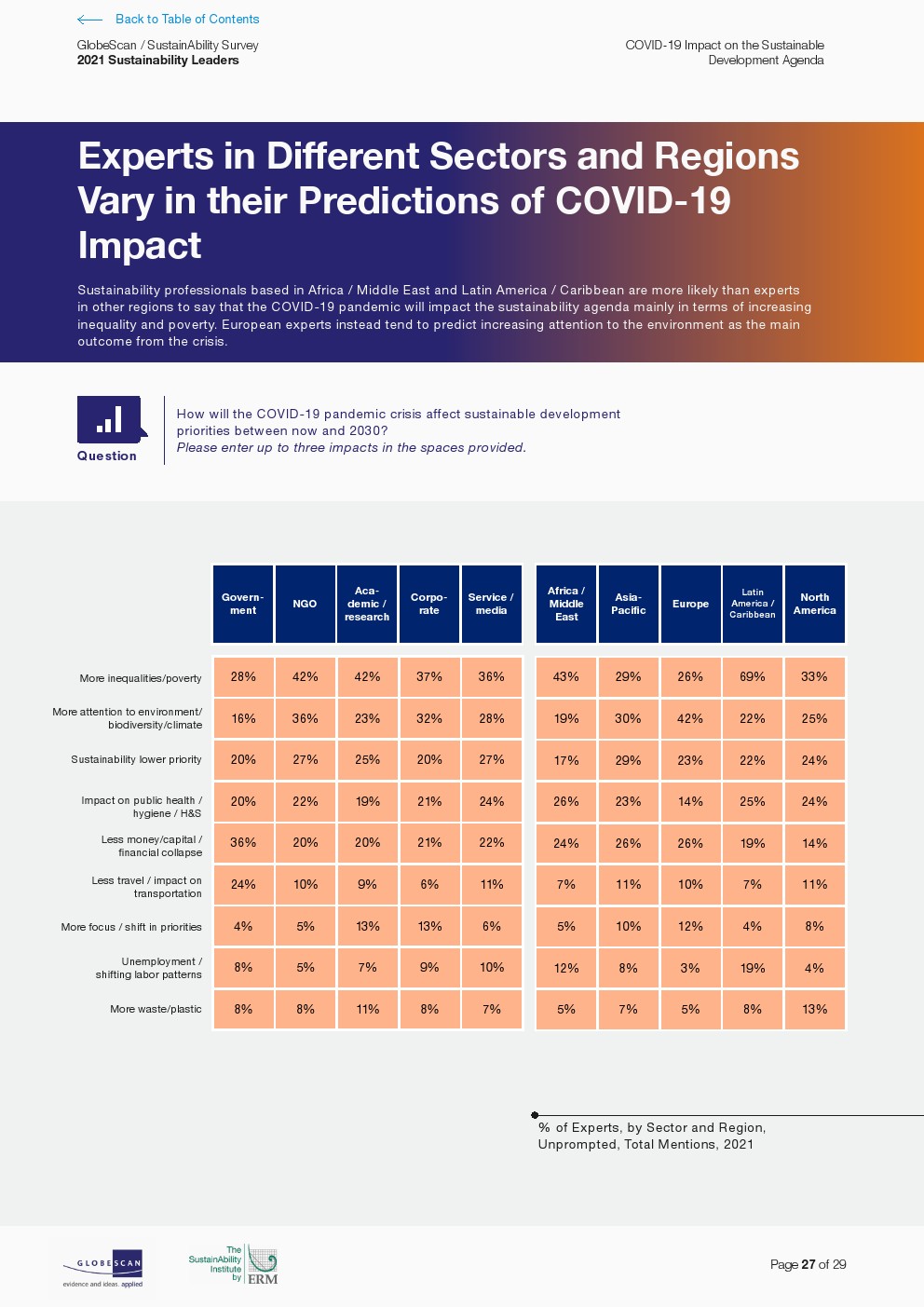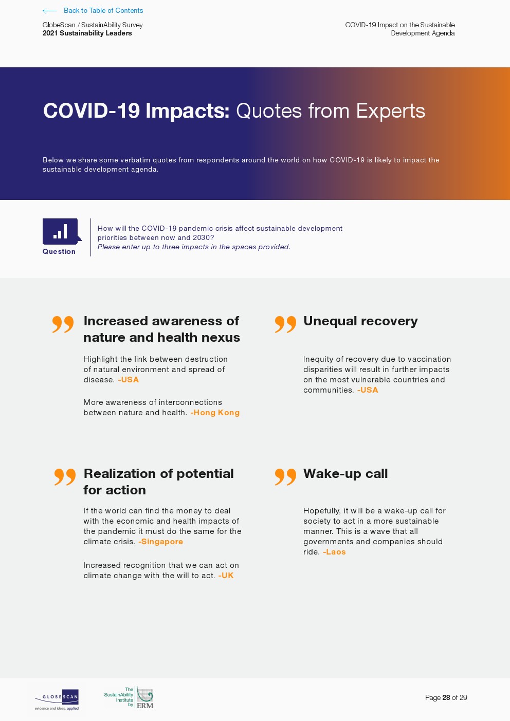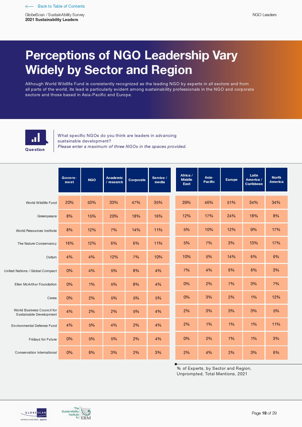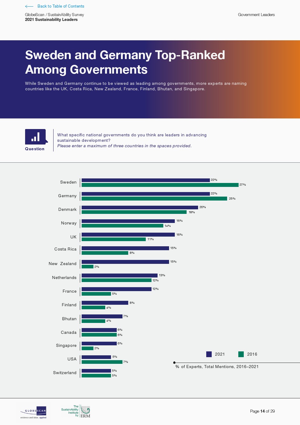 北欧政府主导了对国家可持续发展领导力的积极看法。当被问及哪些国家在可持续发展方面处于领先地位时,专家们大多提到了北欧国家,包括德国、瑞典、丹麦、挪威、英国、荷兰和芬兰政府。哥斯达黎加仍然是排名最高的国家中唯一的拉丁美洲国家,并与新西兰并列第六。