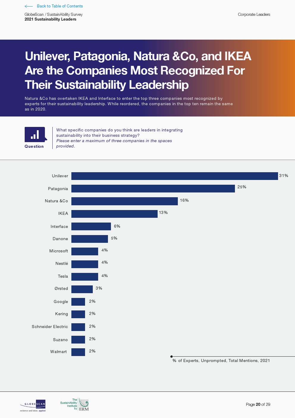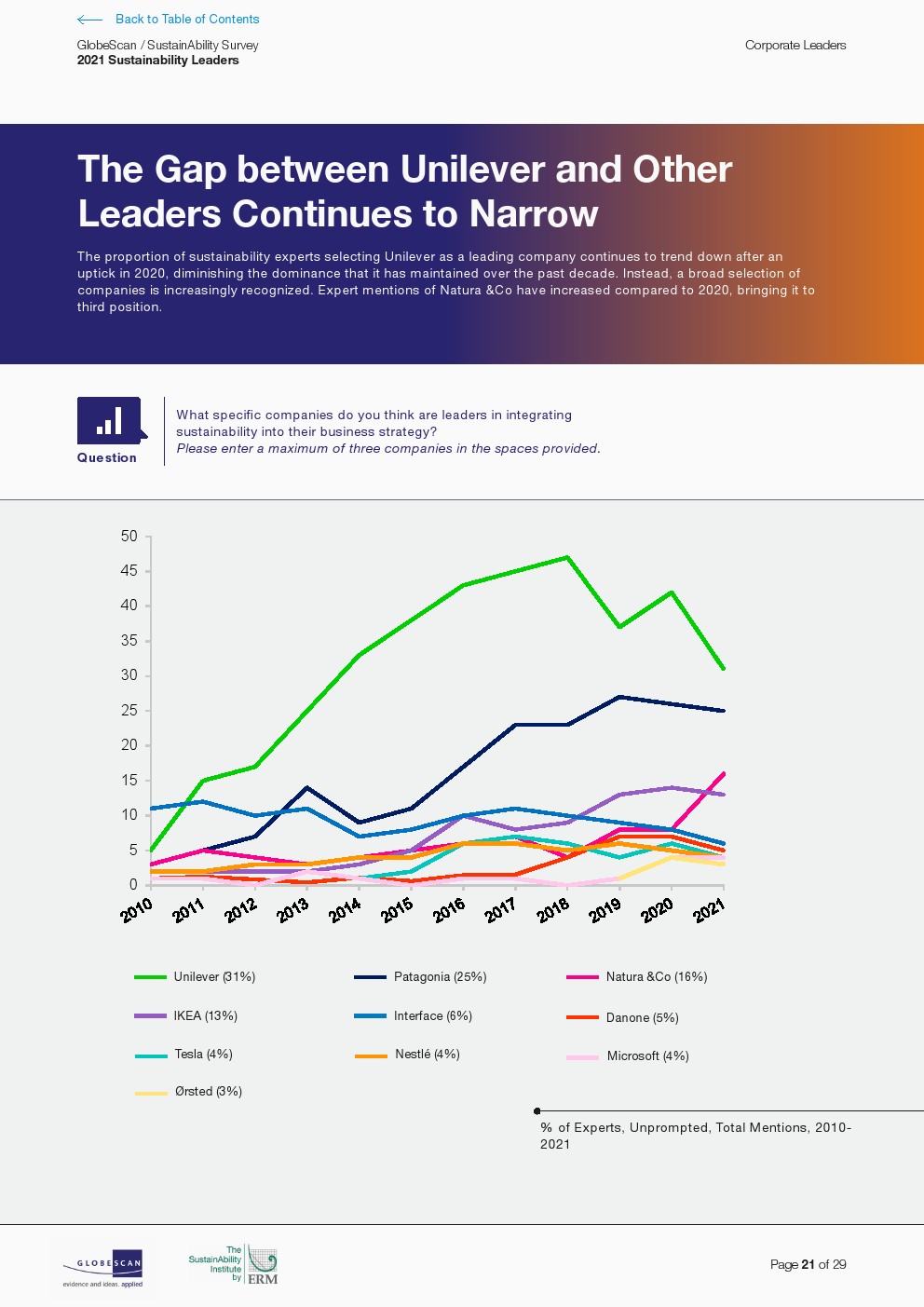 2021 年和 2020 年排名前十的公司依次是联合利华、巴塔哥尼亚、Natura &Co、宜家、Interface、达能、微软、雀巢、特斯拉和 Ørsted进入前 15 名的公司包括谷歌、施耐德电气、沃尔玛、开云和 Suzano。