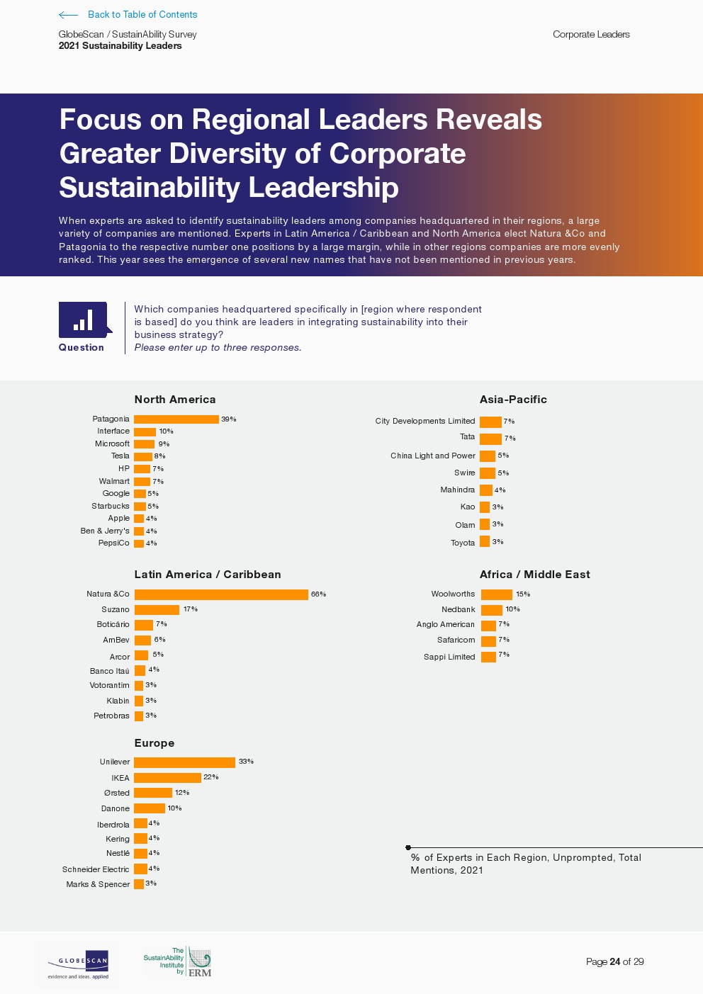 企业可持续发展领导力在区域内变得更加多样化,尤其在亚太和非洲/中东。