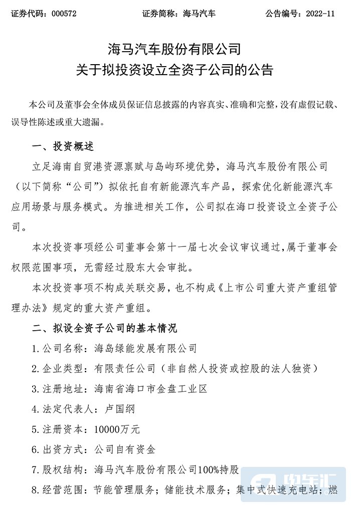 公司名称为海岛绿能发展有限公司,海马汽车股份有限公司100%持股。经营范围包括:节能管理服务;储能技术服务;集中式快速充电站;燃气汽车加气经营;站用加氢及储氢设施销售;资源再生利用技术研发等。