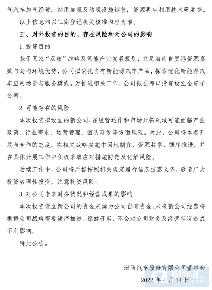 电车汇消息:4月14日,海马汽车发布关于拟投资设立全资子公司的公告。公告披露,立足海南自贸港资源禀赋与岛屿环境优势,依托自有新能源汽车产品,探索优化新能源汽车应用场景与服务模式,海马汽车拟在海口投资设立全资子公司。