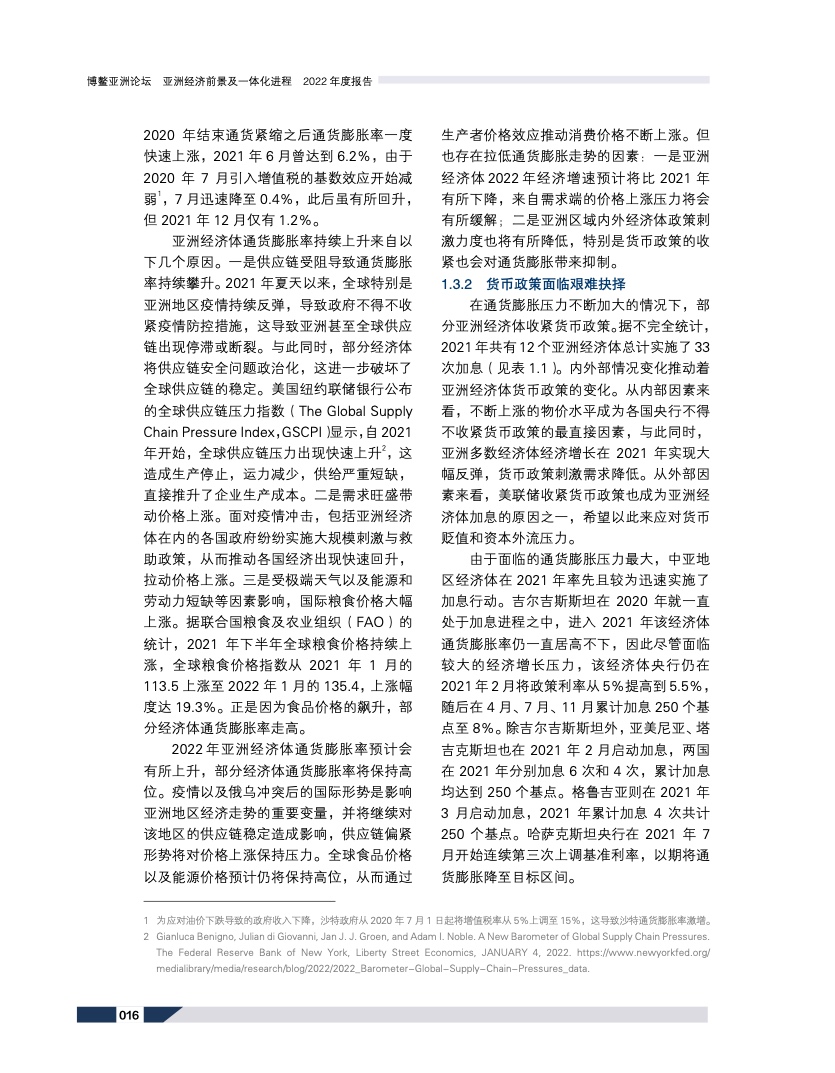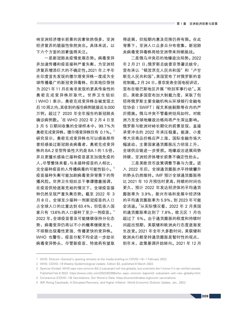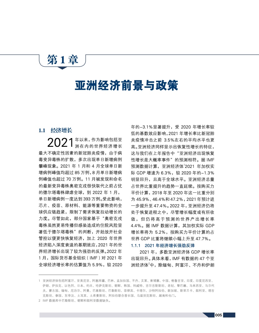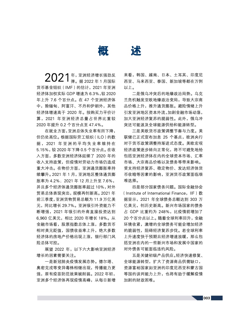 《报告》显示,2022年亚洲经济仍将处于恢复进程之中,但增长幅度或有所收敛,2022年亚洲经济增速很可能低于当前IMF预测值(5.2%)。同时该《报告》指出,要关注六大影响亚洲经济增长的因素:一是新冠肺炎疫情发展态势;二是俄乌冲突后的地缘政治局势;三是美欧货币政策调整节奏与力度;四是部分国家债务问题;五是关键初级产品供应;六是部分国家政府换届。