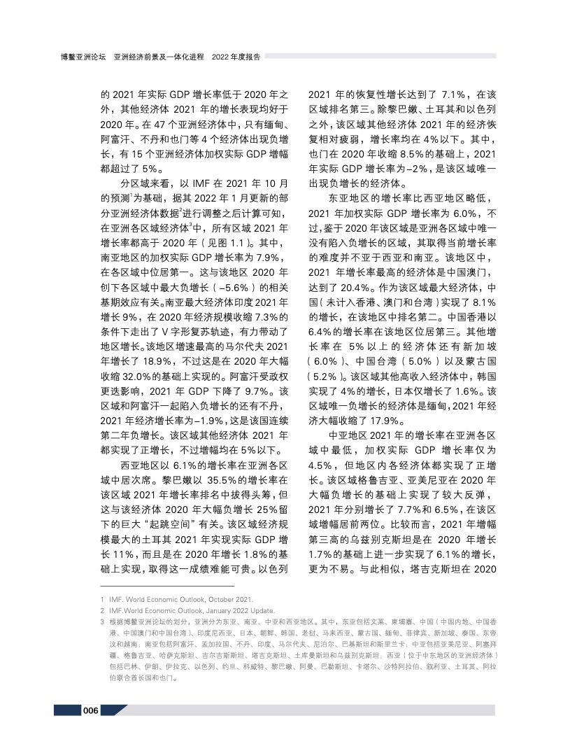 2021年,亚洲经济增长强劲反弹。据2022年1月国际货币基金组织(IMF)的估计,2021年亚洲经济体加权实际GDP增速为6.3%,较2020年上升7.6个百分点。在47个亚洲经济体中,除缅甸、阿富汗、不丹和伊朗外,其他经济体增速高于2020年。按购买力平价标准计算,2021年亚洲经济总量占世界比重较2020年提升0.2个百分点至47.4%。