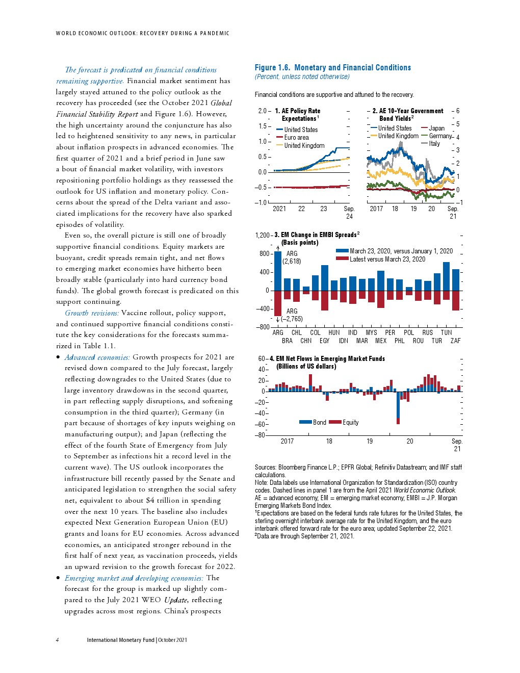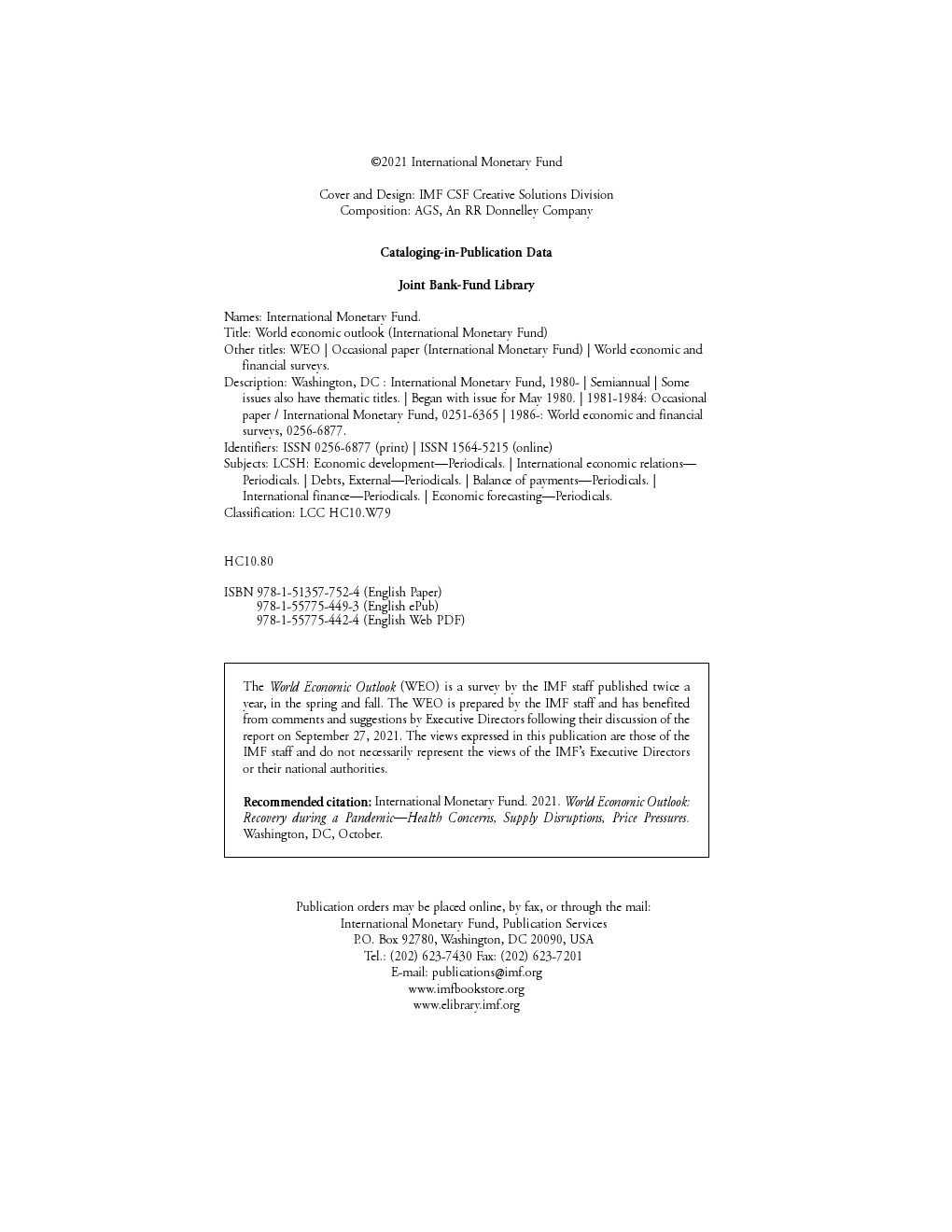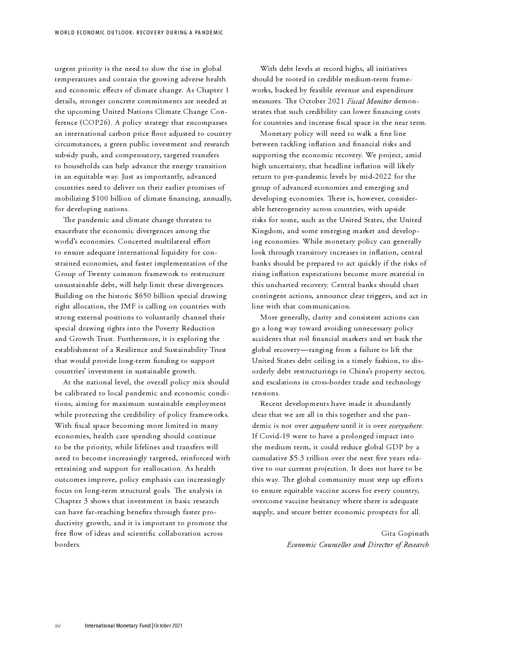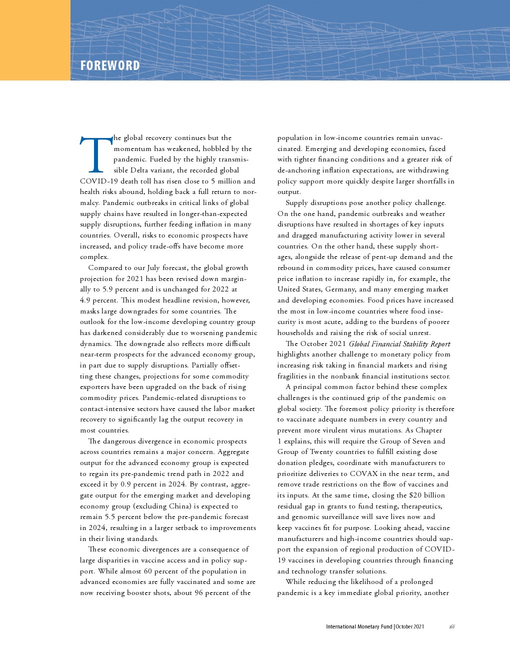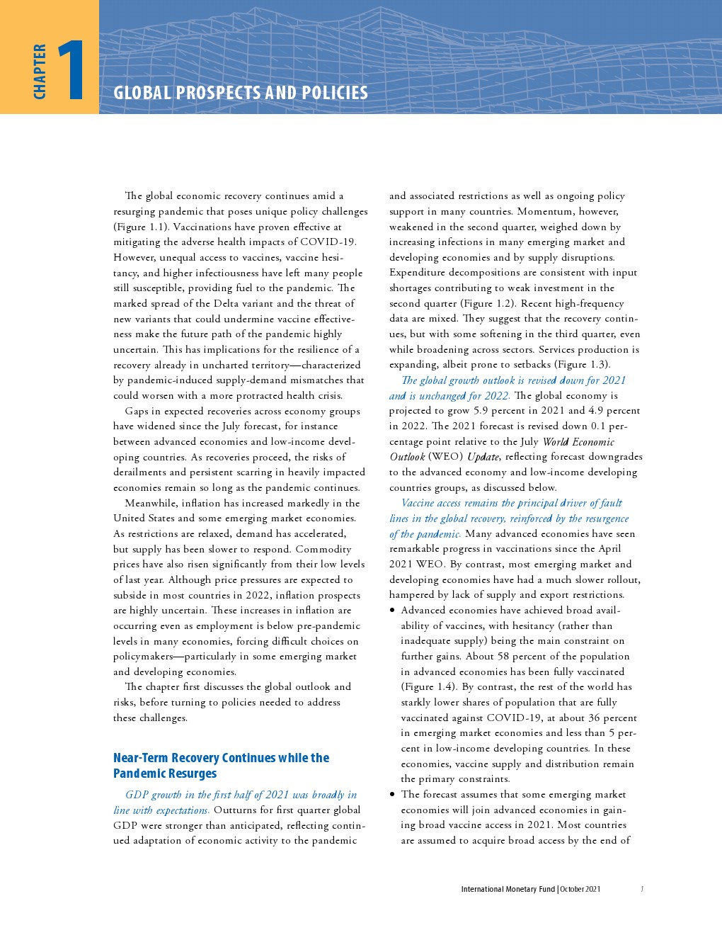 如果大流行引起的供需不匹配持续时间长于预期,通胀风险倾向于上行,并可能成为现实,从而导致更持续的价格压力和通胀上升,促使发达经济体的货币正常化速度快于预期。 加快全球疫苗供应、向受限制的经济体提供流动资金和债务减免以及适应气候变化的多边努力仍然必不可少。加快世界人口的疫苗接种仍然是首要政策优先事项,同时继续推动广泛的测试和疗法投资。这将挽救数百万人的生命,有助于防止新变种的出现,并加速全球经济复苏。
