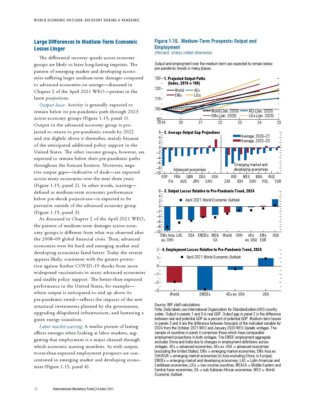 预计到2022年以后,全球经济增长将放缓至3.3%左右。发达经济体的产出预计将超过大流行前的预测。相比之下,新兴市场和发展中经济体的产出将持续下降,因为与发达经济体相比,疫苗推广速度较慢,政策支持通常较少。
