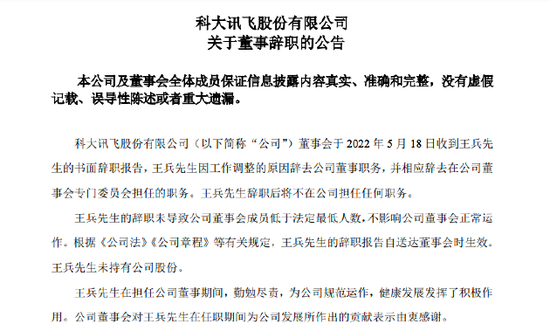 新浪科技讯 5月18日晚间消息,科大讯飞发公告称,王兵因工作调整的原因辞去公司董事职务,并相应辞去在公司董事会专门委员会担任的职务。王兵辞职后将不在公司担任任何职务。