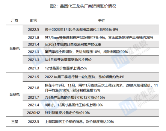 而台积电、三星和联电凭借可持续的客户订单优势、多元化的产能供给及全球领先的技术研发进度,目前囊括了全球三分之二的晶圆代工市占率。在代工价格再度“普涨”之际,半导体设计企业不得不再次直面供应链涨价的冲击。