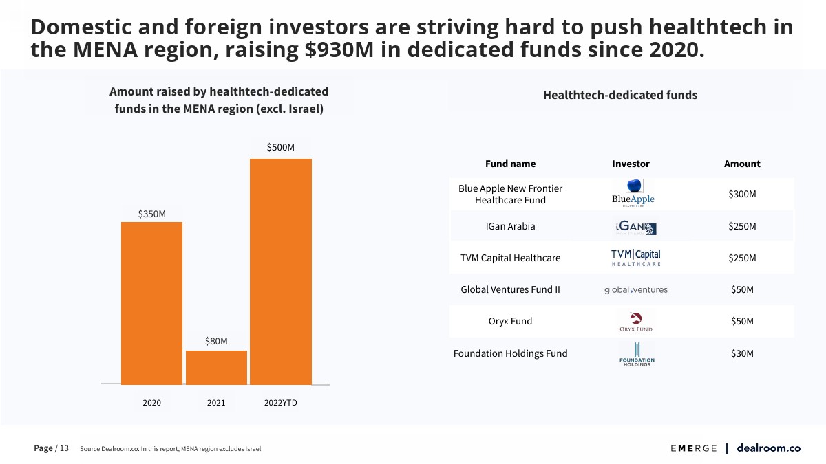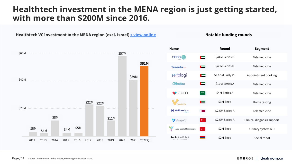 随着海湾合作委员会各国政府投资升级医疗保健,医疗科技初创公司获得了大量的机会。2010-2020年间,海湾合作委员会地区的医疗基础设施投资快速增长。大多数风险投资活动和价值创造主要集中在改善患者体验的初创公司。中东和北非地区的医疗科技是自2016年以来企业总价值增长最快的垂直行业。