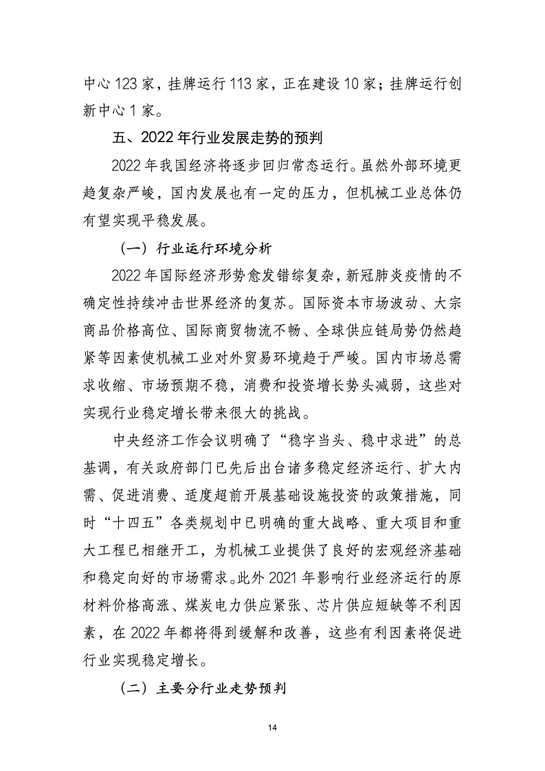 2021 年机械工业经济运行虽受疫情散发、芯片短缺、原材料价格高涨、电力供应紧张等多种困难影响,但全行业经济运行总体平稳,产品生产基本稳定。全年经济运行态势“前高后低”,一季度高位运行,二季度逐月下滑,三季度下滑幅度加大,四季度趋向平稳,年底出现翘尾;年度主要经济指标增幅超出预期。