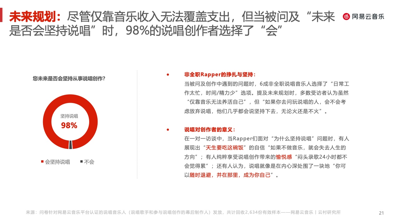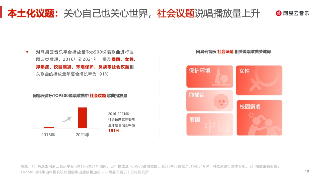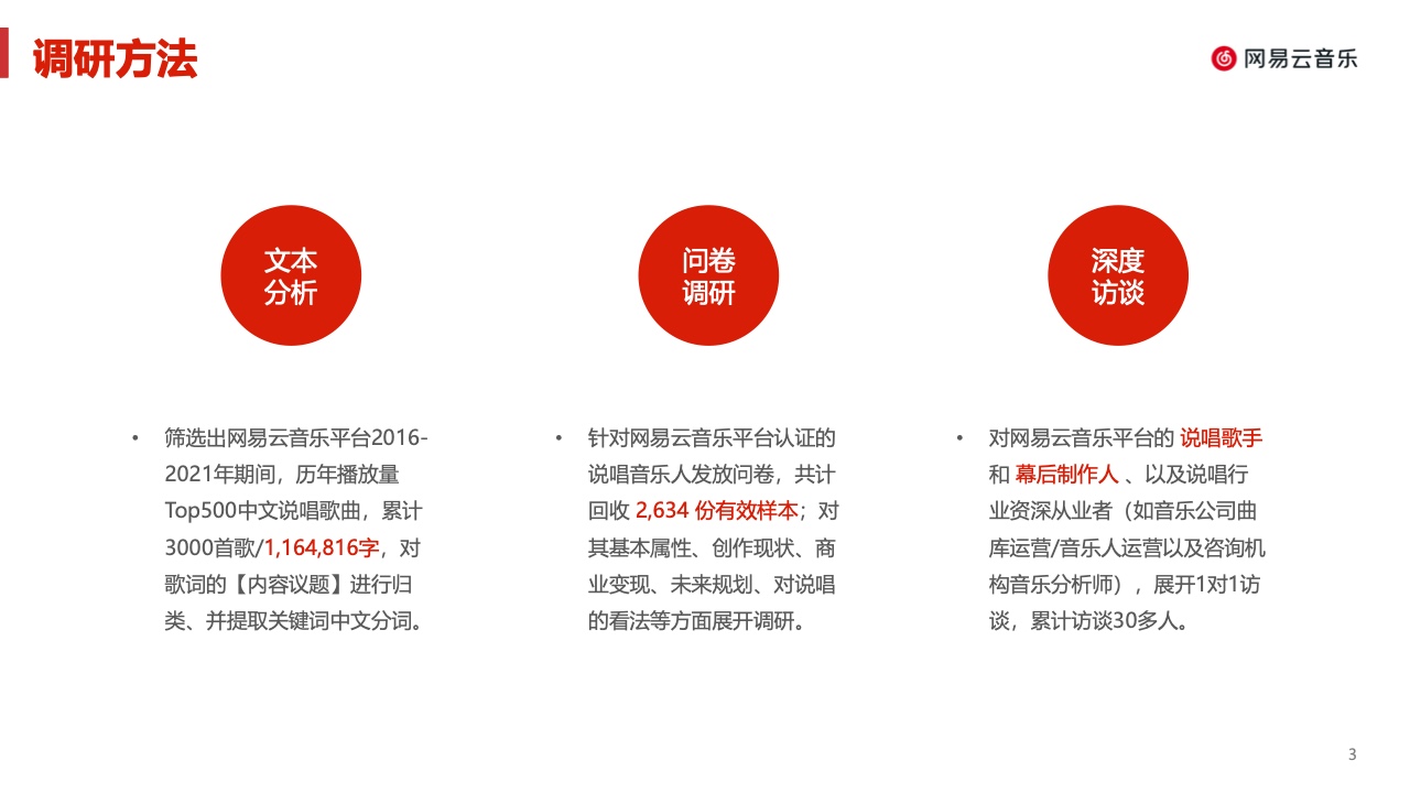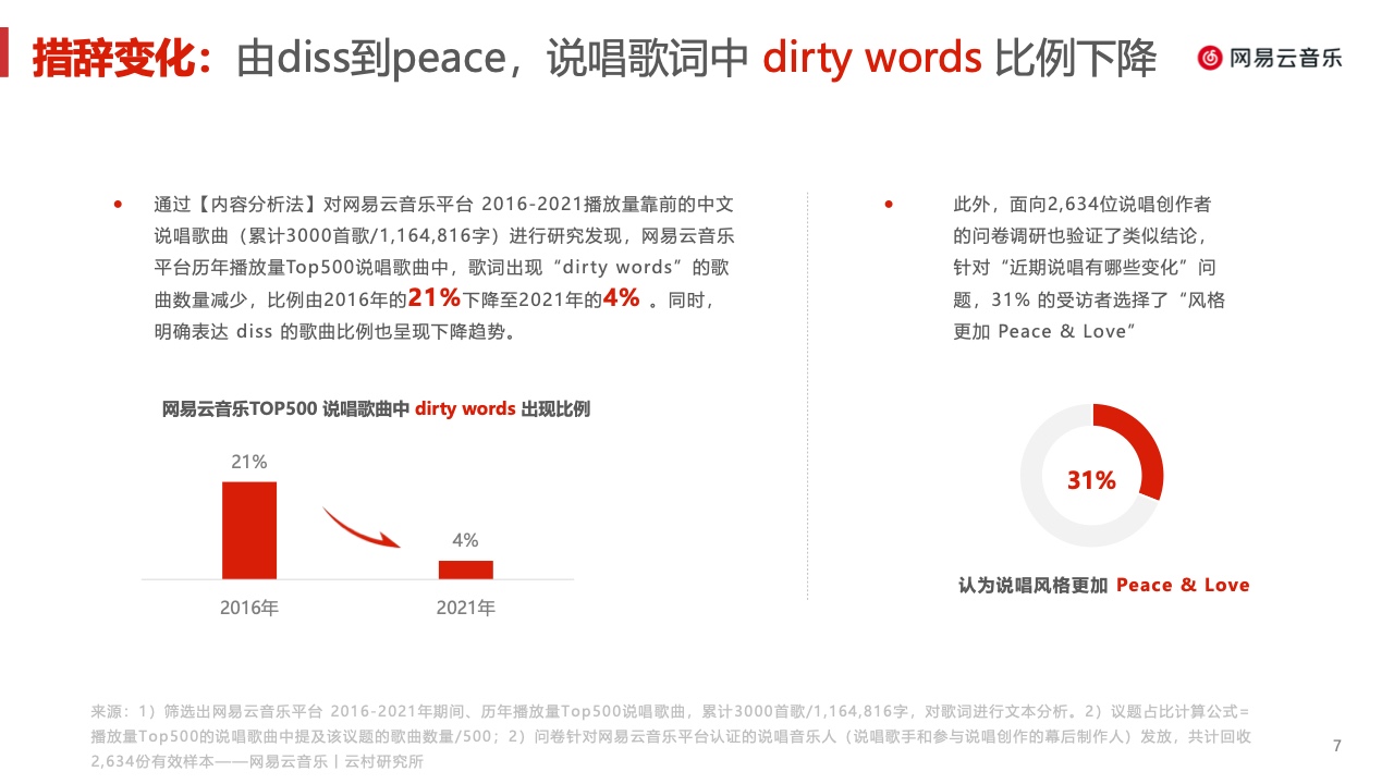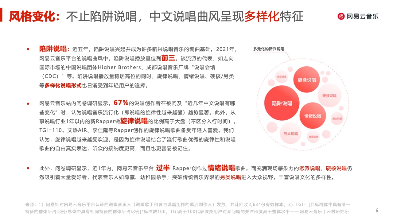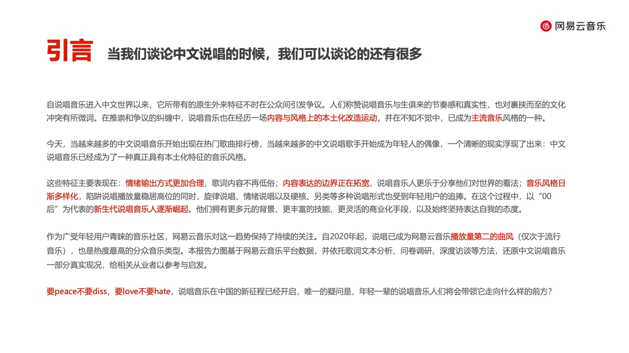 作为广受年轻用户青睐的音乐社区,网易云音乐对这一趋势保持了持续的关注。自2020年起,说唱已成为网易云音乐播放量第二的曲风(仅次于流行 音乐),也是热度最高的分众音乐类型。本报告力图基于网易云音乐平台数据,并依托歌词文本分析、问卷调研、深度访谈等方法,还原中文说唱音乐 一部分真实现况,给相关从业者以参考与启发。