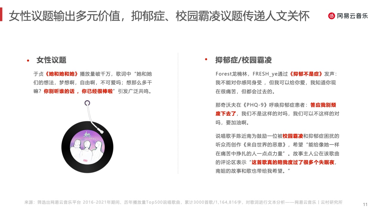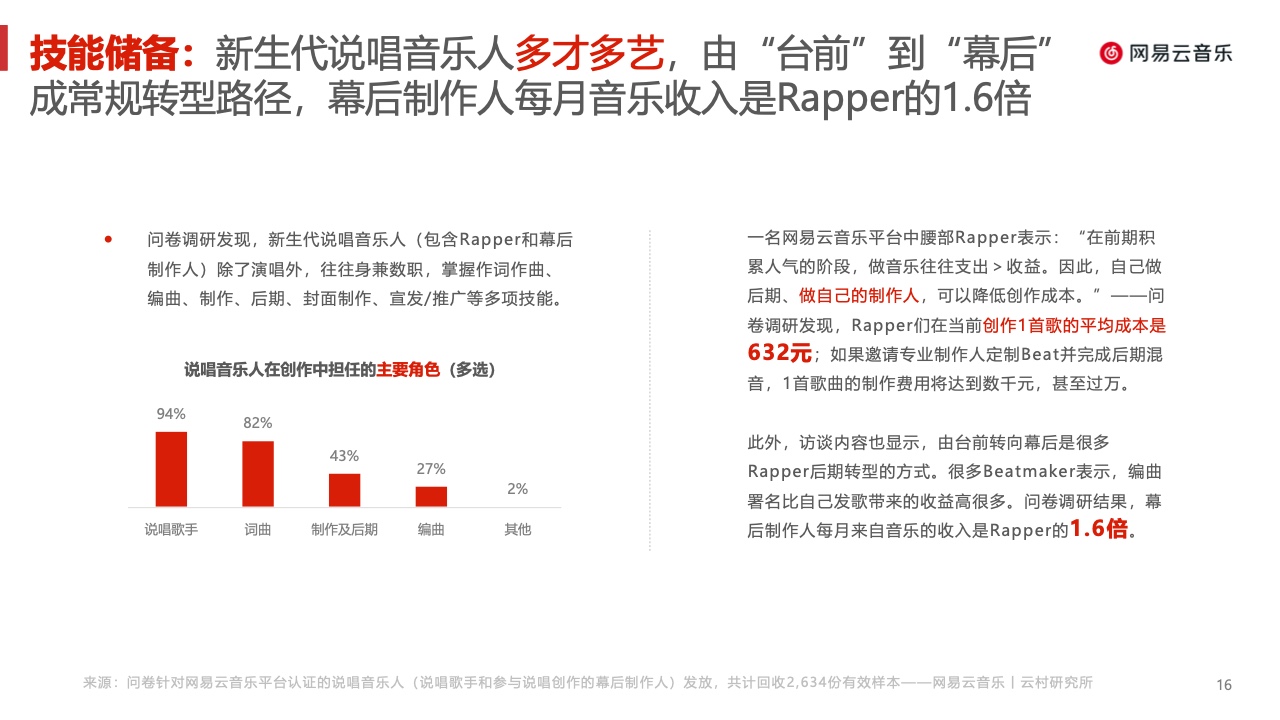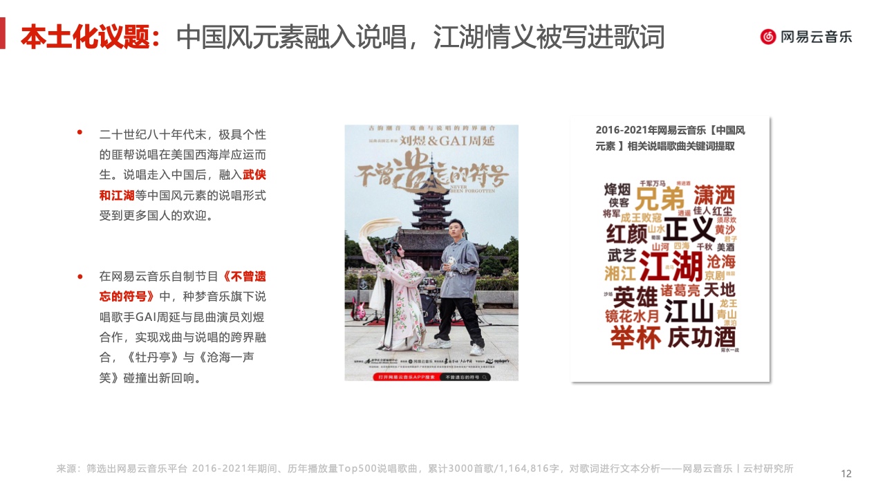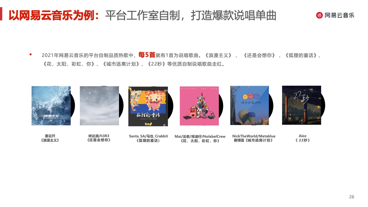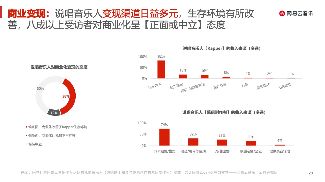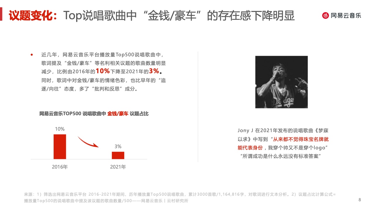 作为广受年轻用户青睐的音乐社区,网易云音乐对这一趋势保持了持续的关注。自2020年起,说唱已成为网易云音乐播放量第二的曲风(仅次于流行 音乐),也是热度最高的分众音乐类型。本报告力图基于网易云音乐平台数据,并依托歌词文本分析、问卷调研、深度访谈等方法,还原中文说唱音乐 一部分真实现况,给相关从业者以参考与启发。