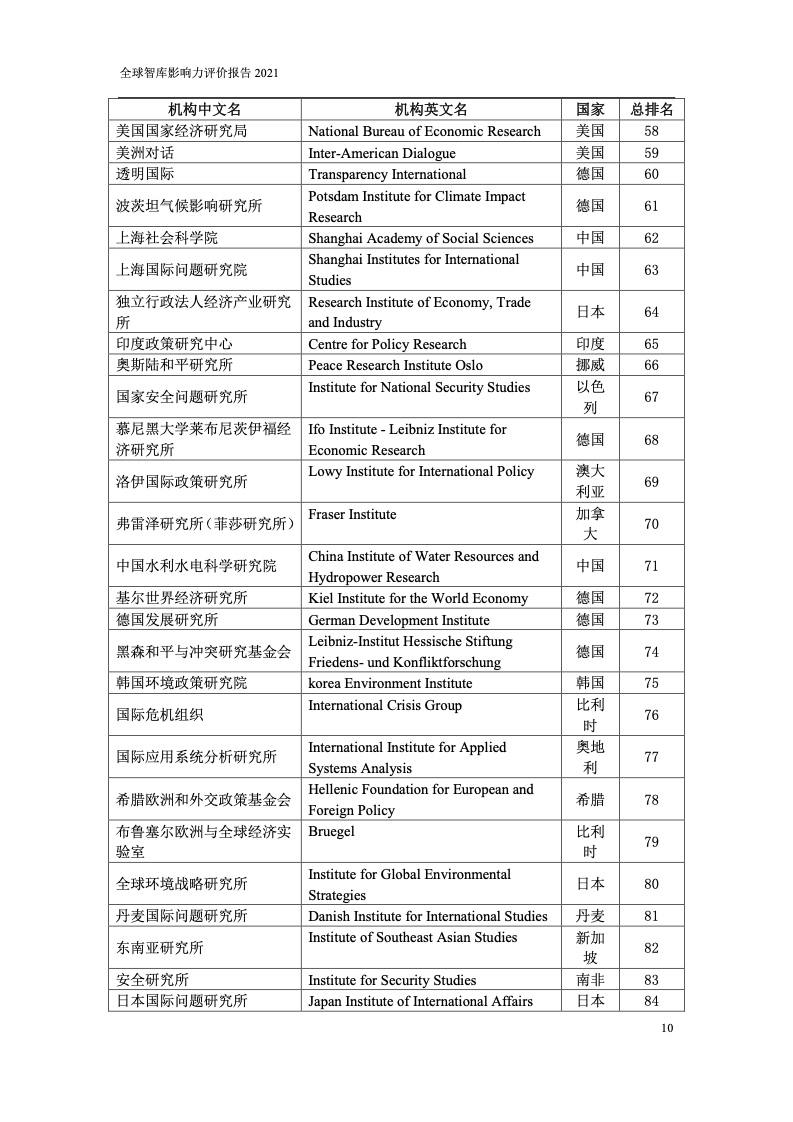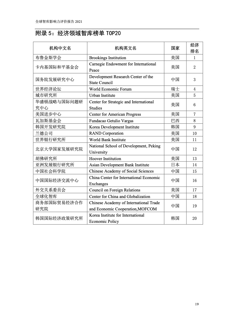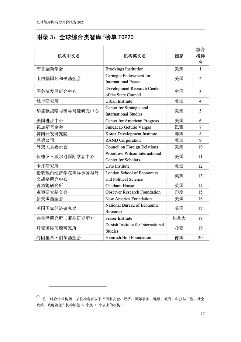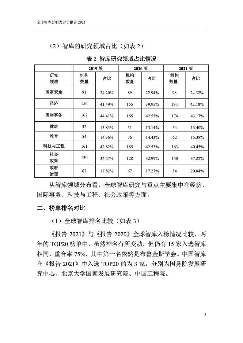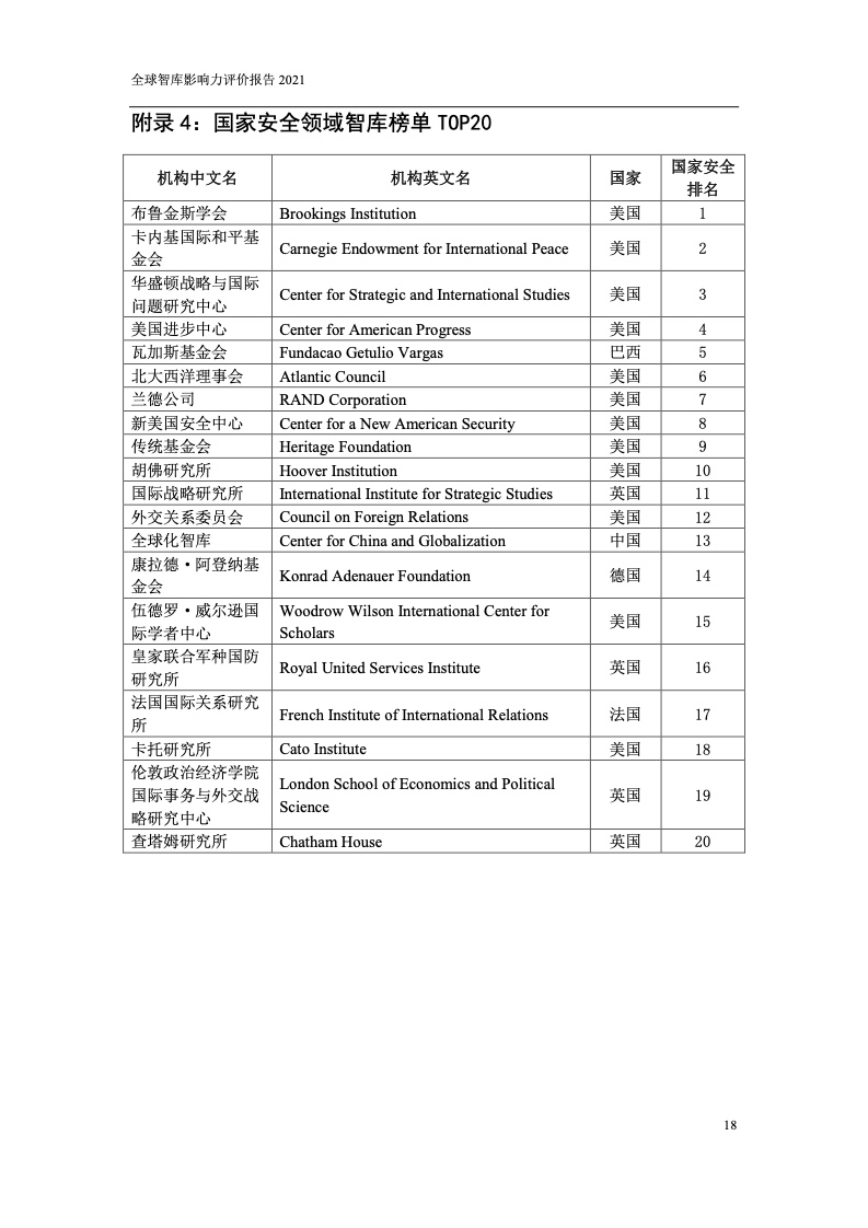 本次报告共发布全球智库TOP100、中国智库TOP100、全球综合类智库TOP20共3个综合榜单,以及国家安全、经济、国际事务等8个分领域TOP20榜单。