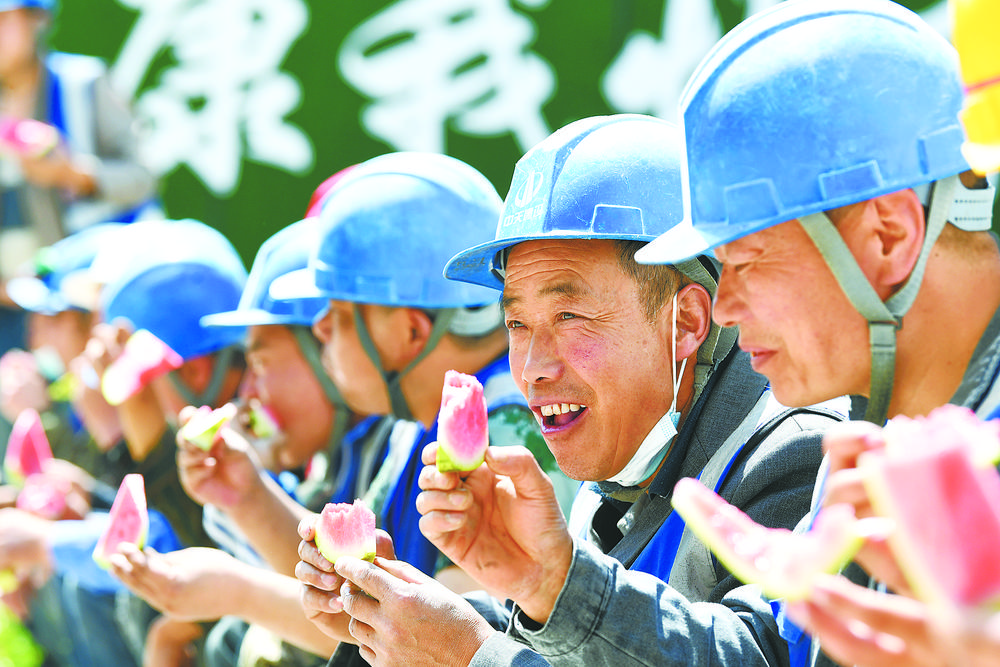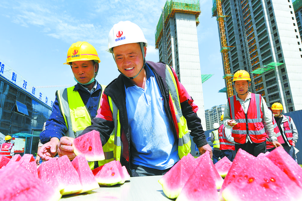 7月13日,西宁天气炎热,酷暑难当。当天上午,西宁市城中区总工会开展“盛夏送清凉,关爱在一线”活动,将1.7万公斤西瓜送到一线工作人员和工地建设者手里,为他们带去关爱和清凉。图为时代大道一建设工地送清凉活动现场。