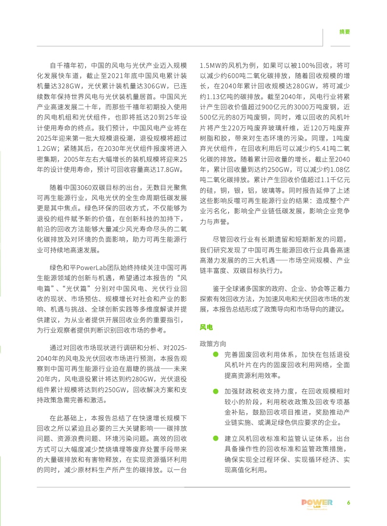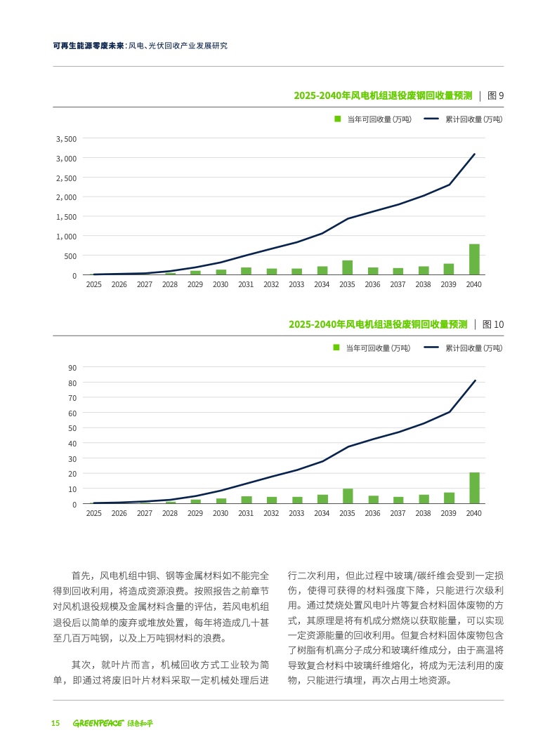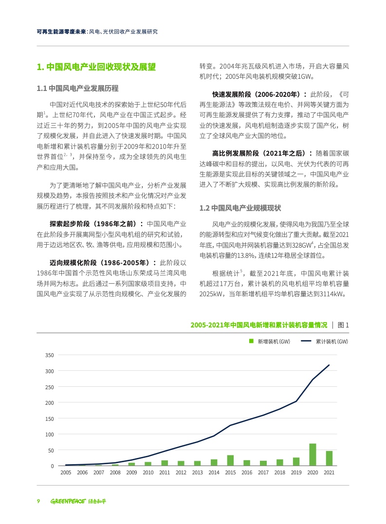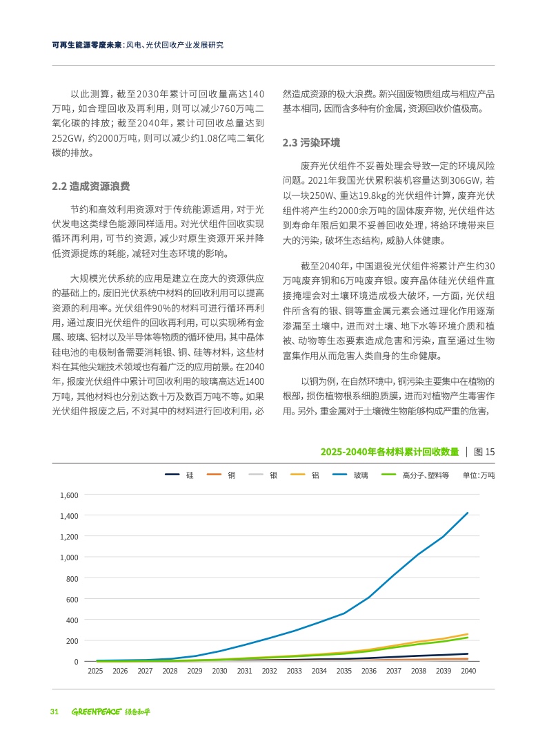 国际环保组织绿色和平今日发布了《可再生能源零废未来:风电、光伏回收产业发展研究》(下称“报告”),分别对中国风电、光伏行业的回收现状与市场规模、回收规模增长对社会的影响、全球创新实践等多维度进行解读并提出建议,为行业发展以及参与者提供重要指引。