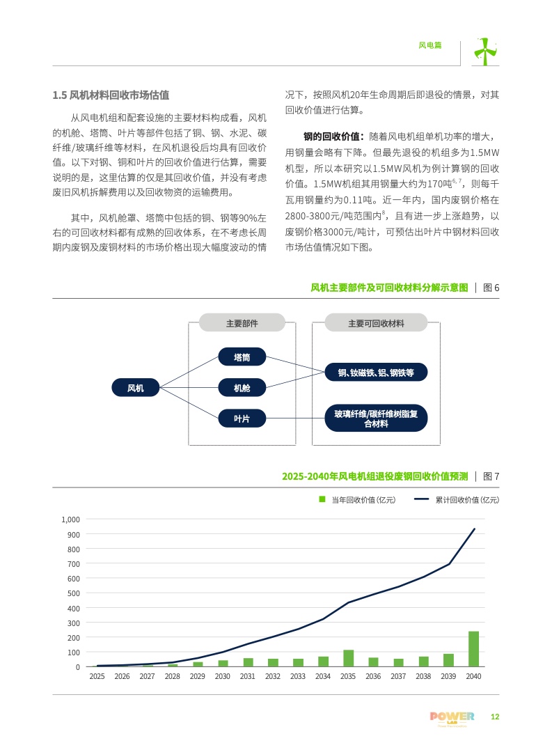 绿色环保的回收方式同样能够缓解装机退役随之而来的环境污染与资源浪费。以风电为例,至2040年,风电行业将累计产生3000万吨废钢、回收价值超过900亿元,以及80万吨废铜、回收价值近500亿元。同时,难以回收的风机叶片将产生220万吨废弃玻璃纤维,以及近120万吨废弃树脂和胶,若回收不当将造成生态环境污染。