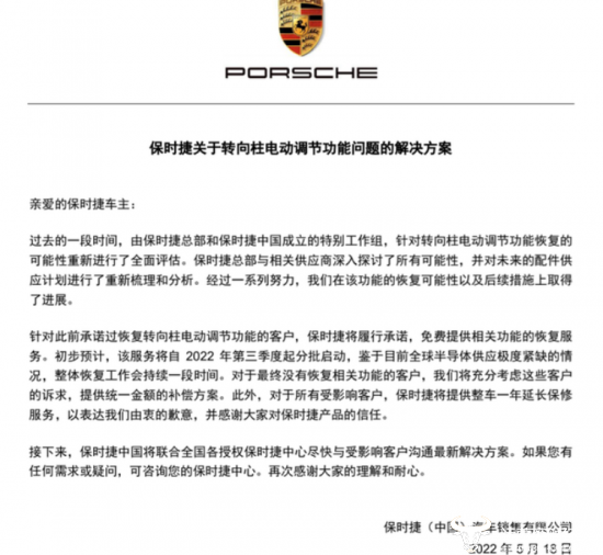 今年5月,保时捷中国提供了最新的解决方案:对承诺过恢复转向柱电动调节功能的客户,将分批进行免费的功能恢复;对未能进行功能恢复的客户给予一定金额赔偿;所有受到影响的客户,品牌方将提供一年整车延保服务。