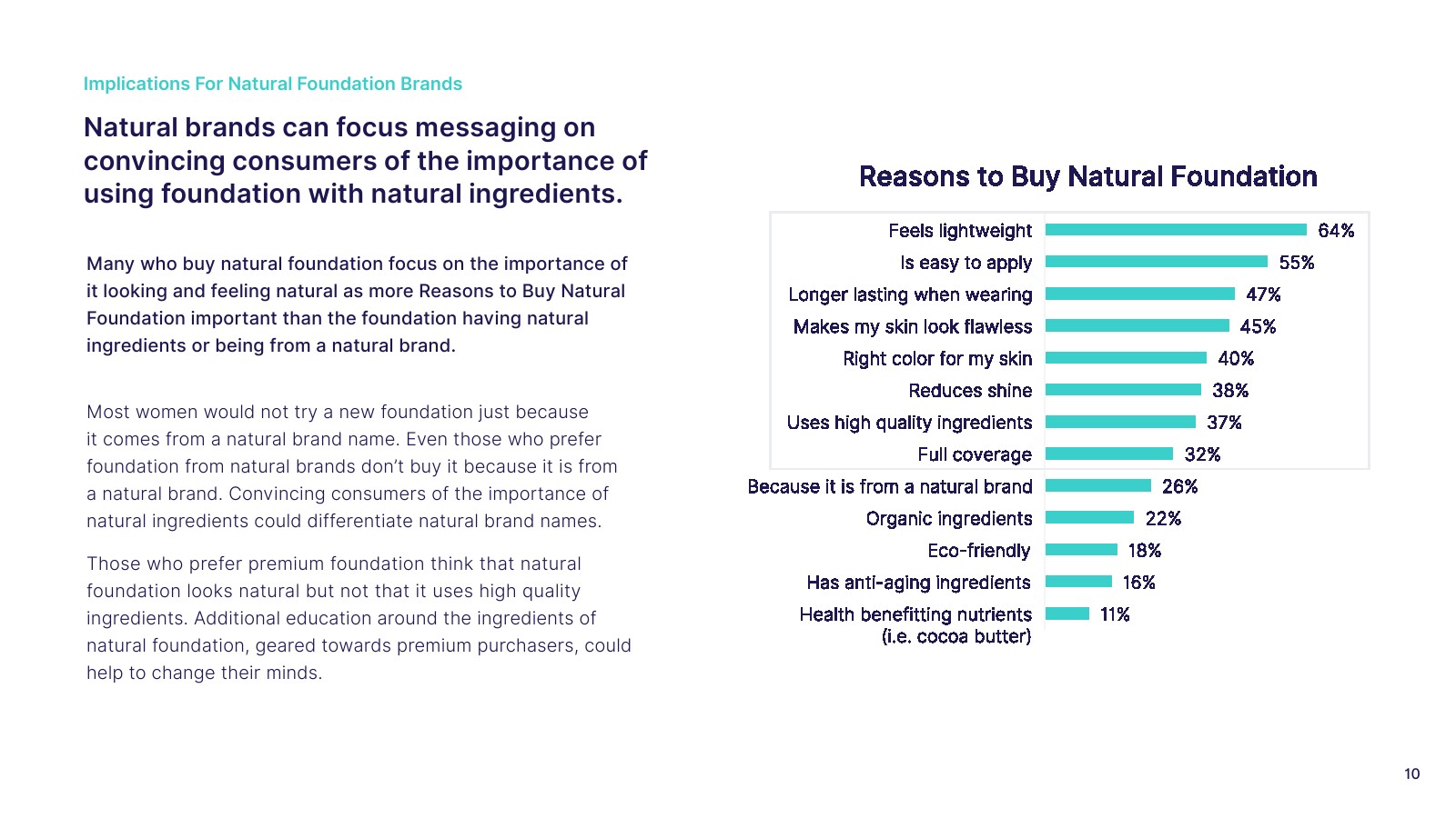 许多购买天然粉底的受访者关注它看起来和感觉自然的重要性,因为购买天然粉底的理由比具有天然成分或来自天然品牌的粉底更重要。