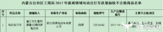 另外,内蒙古自治区工商局对电动车市场进行了抽查,在不合格产品中绿源电动车也有一款上榜。此次被内蒙古自治区工商局抽查不合格的绿源电动车型号为TDT1454Z,不合格项主要是最高车速、整车质量、脚踏行驶能力、说明书的要求。