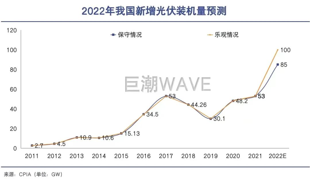 通威股份股价表现(2019年1月至今)硅料价格持续高企的大背景下,近两年越来越多的下游组件厂商为了追求利润和供应链稳定,开始转向一体化战略,向上游硅料环节延伸。目前光伏产业链条的主要构成,包括了硅料、硅片、太阳能电池、光伏组件、应用系统(主要是光伏电站)5个产业链环节,选择一体化战略的企业往往在现有业务基础上,向上游或下游发展,希望将产业链环节全部占领。当所有玩家都开始将手伸到其他玩家碗里,试图通吃一切,整个光伏的内卷程度再上层楼。而硅料环节最重要的生产企业通威股份同样也在谋求一体化,依托于庞大的硅料产能,这个一体化玩家看起来甚至要比其他对手更加可怕。“拥硅为王”,仍在继续年初以来,光伏赛道保持了高度的景气。从已发布的数据来看,今年无疑是一个光伏大年。国家能源局发布的全国电力工业统计数据显示,今年 1-6月光伏累计新增装机30.88GW,同比增长137.4%。据此,光伏行业协会预测,2022年我国光伏新增装机量预计为85-100GW,同比增长将达到60%-89%,较此前预测调高10GW。