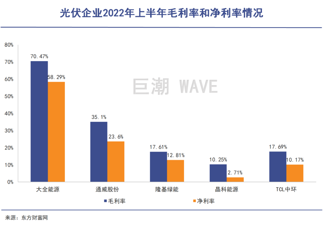 国际市场方面,根据光伏行业协会数据,上半年我国光伏组件出口量达到78.6GW,同比增长74.3%。这意味着来自海外的需求也同样不差。经济增长整体承压的大背景下,光伏赛道的高增速实属难得,也因此收获了资本市场的高度青睐。光伏ETF(515790)自今年4月A股行情低点后持续反弹,净值从1.04涨至1.876,最高涨幅超过80%。但从已公布的半年报业绩来看,并非所有玩家都能够充分享受光伏行业的高度景气——飙涨的硅料挤压了硅片、电池片、组件环节的利润,其他玩家们似乎都在被动“为上游打工”。在这场光伏盛宴中,上游吃肉,下游喝汤。公开财报显示,硅料龙头通威股份上半年实现营业收入603.4亿元,同比增长127.2%;实现利润总额168亿元,同比增长350%;大全能源上半年营收同比增长262.16%,归属净利润则同比增长了340.81%。作为对比,以隆基绿能、晶科能源为代表的一体化光伏企业,虽然同样实现了可观的增长,但其净利润增速明显低于营收增速。如隆基绿能上半年营收同比增长了43.64%,归属净利润“仅”同比增长了29.79%。硅料企业和其他环节企业的盈利水平也有着显著差异。上半年硅料企业如大全能源的毛利率超过70%,赚钱能力堪比茅台,完全不像是制造业企业的盈利水平;而隆基、晶科、中环等其他环节玩家的毛利率则不到20%。可以说,作为产业链中话语权最高的瓶颈环节,硅料在2022年再次烫伤了光伏行业。随着硅料价格不断飙升,国内不少二三线光伏组件企业已经降低了开工率。下游电站方面,价格敏感度比较高的集中式电站需求也明显受到抑制。此外,高硅料价格还可能造成未来组件厂商库存跌价的损失。市场机构PVInfoLink在8月25日发表的周评中表示,“在目前高昂的成本下,不论是组件还是终端对于价格的坚持都不愿退步,由此造成的组件库存积累也将对组件厂家造成损害。”过度竞争,隐忧出现虽然一路飙涨的硅料,对行业短期内的景气度、其他环节的利润都有明显的负面影响,但资本市场最大的担忧并不在于产业链失衡,而在于整个行业全方位的过度竞争和产能过剩。8月19日,通威股份拟中标华润电力3GW光伏项目光伏组件设备集采的消息引起了光伏行业的“巨震”。天合光能当日盘中最大跌幅超16%,隆基绿能最大跌幅超8%,晶澳科技的股价更是触及跌停。而通威的股价则逆势上涨了4.88%。究其原因,通威中标项目的消息,已经被市场视为其正式进军组件板块的标志。且凭借硅料优势,通威的报价要比亿晶光电和隆基股份报价低0.05元/w,也被认为是即将掀起组件价格战的信号。近两年,硅料四大巨头受益于硅料价格飙涨,赚得盆满钵满。一旦切入下游组件环节,硅料的利润完全可以弥补组件的亏损,甚至可以不计成本地抢占市场份额。这无疑将会对组件玩家的利润、甚至是组件行业的格局造成巨大冲击,因此组件龙头的股价集体被“吓趴”了。