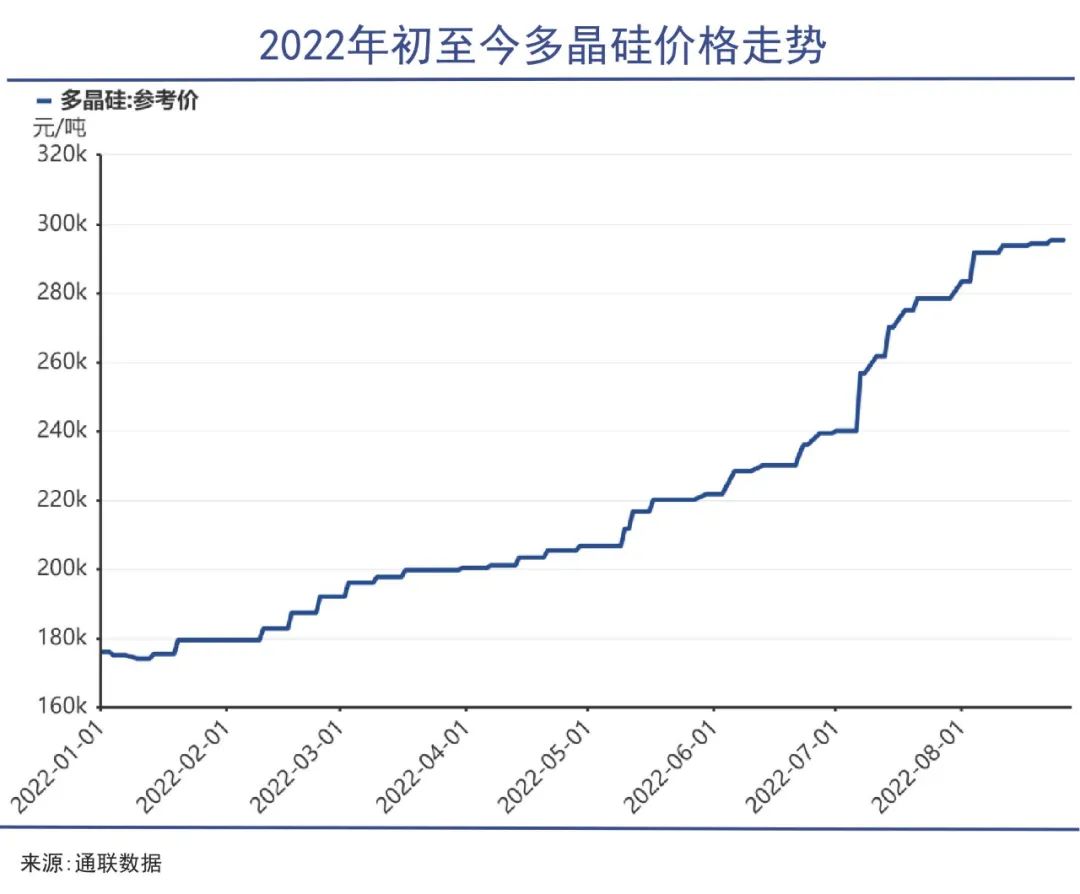 去年和今年上半年很多分析人士都判断,硅料价格将随着时间推移逐渐下降。但令整个光伏行业始料未及的是,自2022年初至今,硅料价格从未跟随产能释放出现价格回落,反而是继续一路飙升,涨到让人咋舌的价位。根据8月24日硅业分会发布的最新成交价,国内单晶复投料价格区间在300-312元/kg,成交均价为306元/kg,相比年初不足100元/kg涨幅超过两倍。这已经年内硅料第28次涨价,且至今没有任何回调迹象。高企的硅料价格不仅挤压了电池片、组件等其他环节的利润率,也传导到终端影响到了下游装机需求,再一次“烫伤了光伏行业”。然而,这次硅料价格达到的历史性高点的影响,将远不止于此。
