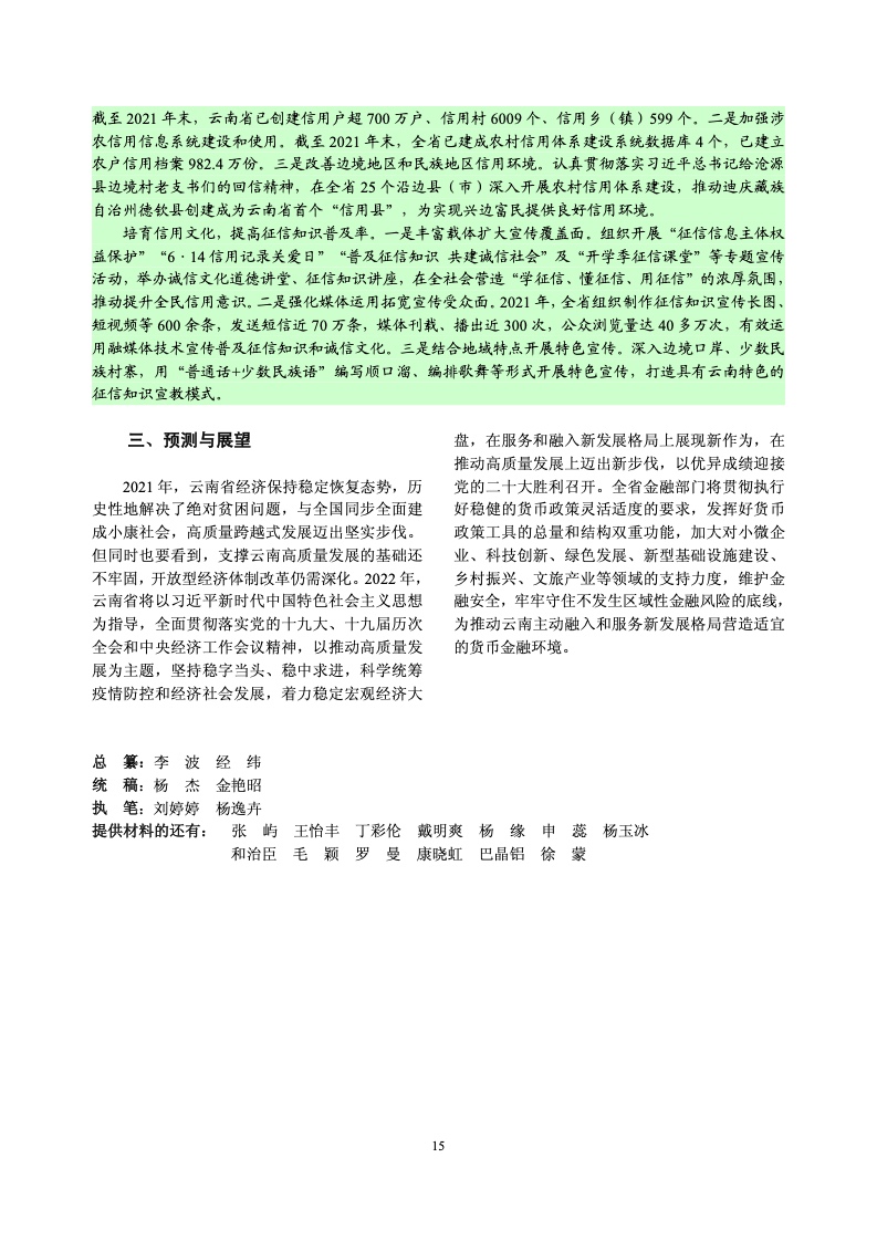 2021 年末,云南省银行业金融机构资产总额 5.1 万亿元,同比增长 6.2%;负债总额 4.9 万亿 元,同比增长 6.2%,增速较上年末分别下降 2.6 和 2.8 个百分点;全年实现净利润 382.4 亿元,资 产利润率为 1.6%;净息差、净利差分别较上年收 窄 0.1 个百分点,盈利能力基本稳定。