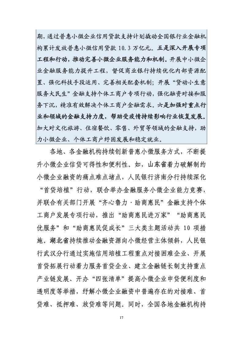 一是普惠金融发展有效应对疫情带来的不利影响,金融支持稳企业保就业方式不断创新,普惠小微贷款持续实现量增、面扩、价降。