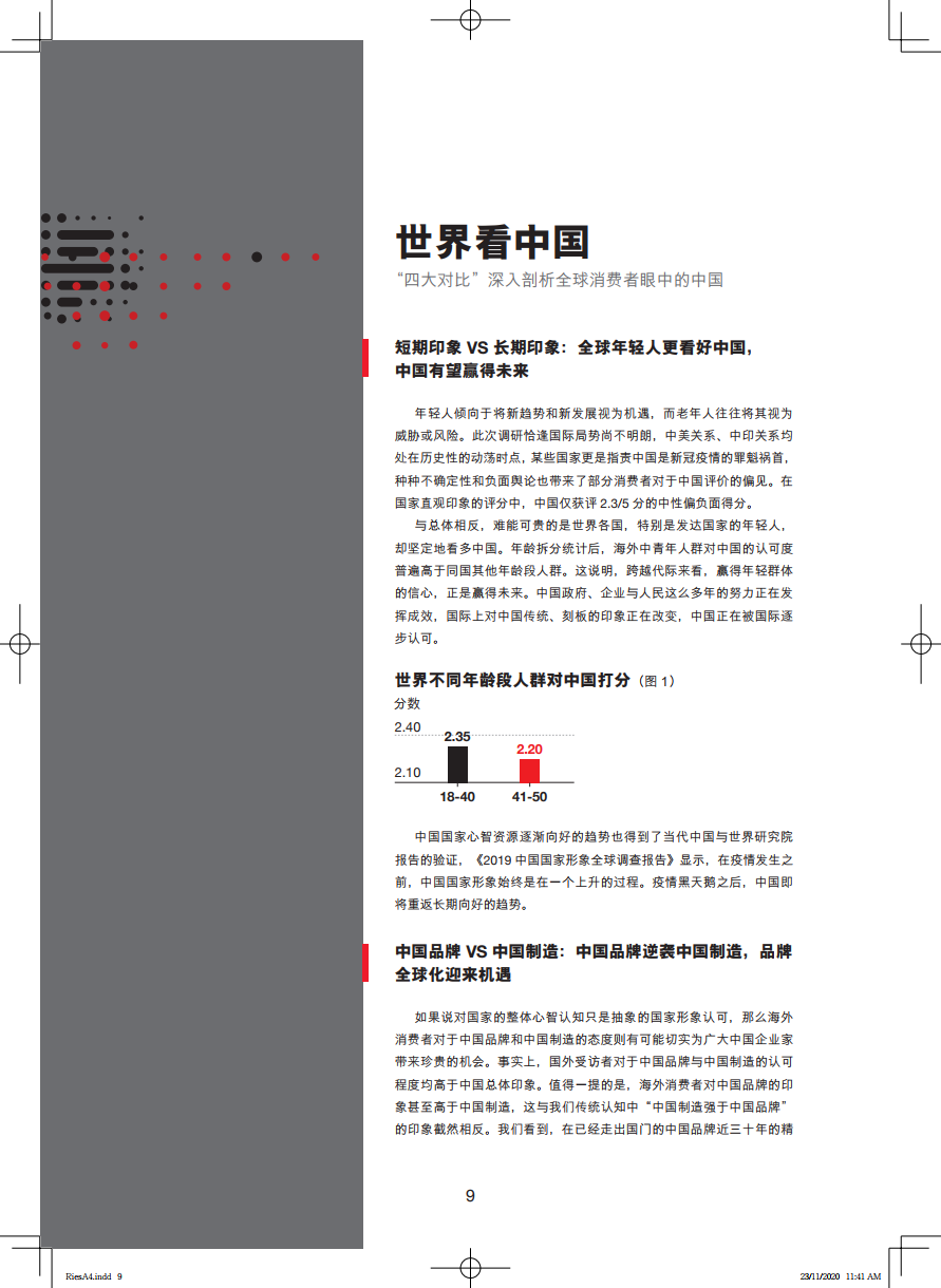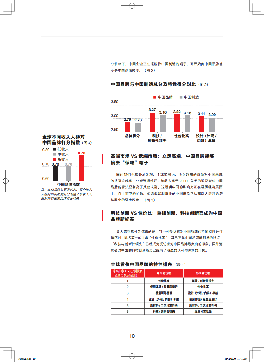 报告还显示,世界对于中国品牌的认知,正在逐渐摘去“低端”帽子。收入越高的群体对中国品牌的认可度越高,传统低端制造业的中国形象正从高端人群开始潜移默化的逐步改善;科技和创新已超越性价比,成为中国品牌的第一标签。同时,全球年轻一代更看好中国,这意味着国际上对中国传统的印象将会改变。