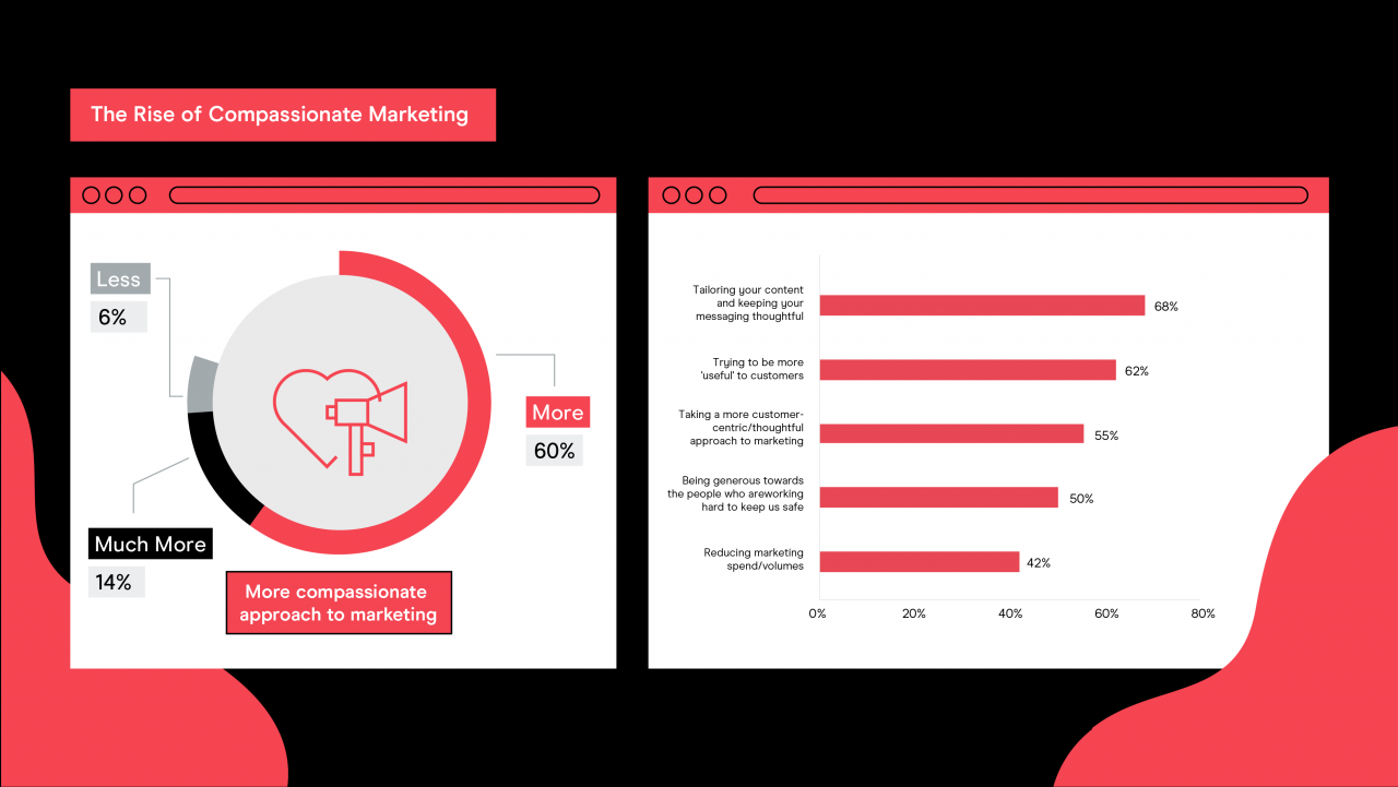 这些体贴的方法包括量身定制内容和周到的消息传递(68%),提供对消费者有用的内容和服务(62%),并采取以客户为中心的方法(55%)。此外,大约一半(50%)的受访者对基础工人更为慷慨,甚至减少了营销支出和数量(42%)以减少这段时间对消费者的影响。