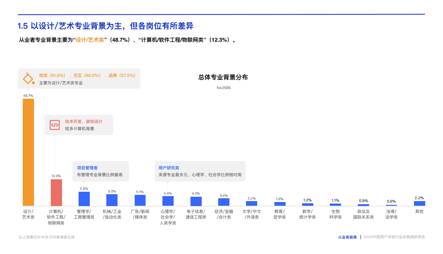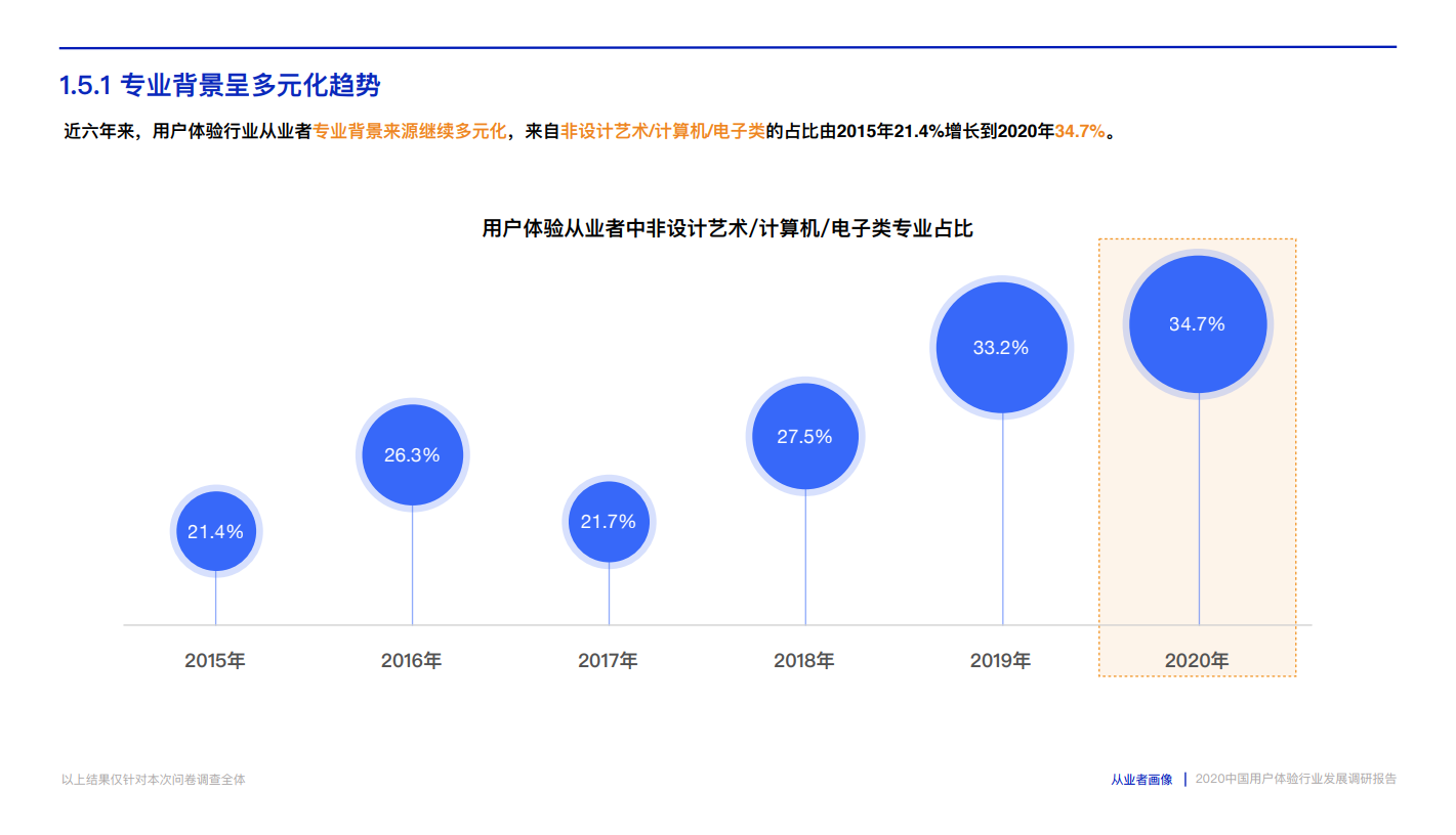 腾讯CDC联合IXDC已连续开展6次“用户体验行业调研”,从从业者画像、企业分布、薪酬变化、未来工作意向等进行追踪。面对“互联网+”、“智能制造”国家战略及以“ABC”(人工智能Artificial Intelligence、大数据Big Data、云计算Cloud Computing)为代表的数字经济新科技驱动设计转型的大背景下,腾讯CDC在2020年调研中新增设计人才市场招聘需求、设计教育分析等,关注设计职能的变迁、人才能力要求的变化等,旨在帮助设计人才供需两侧及设计人才本身快速了解疫情下市场招聘变化、供需两侧变化,推动用户体验行业及设计人才市场持续健康发展。