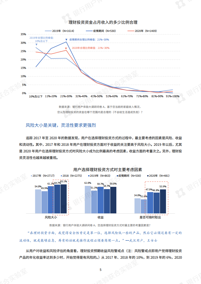 当被问及“理财产品年化收益率超过多少时,会觉得有风险”,用户这一风险警戒点四年来持续下降,从2017/2018年的10%、2019年的6%下降至后疫情时期的5.0%,创下四年新低。这意味着用户风险意识正在逐年加强,对理财产品的收益-风险的认知更加全面。