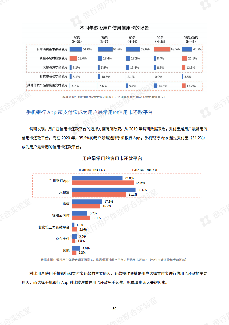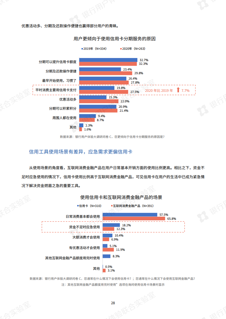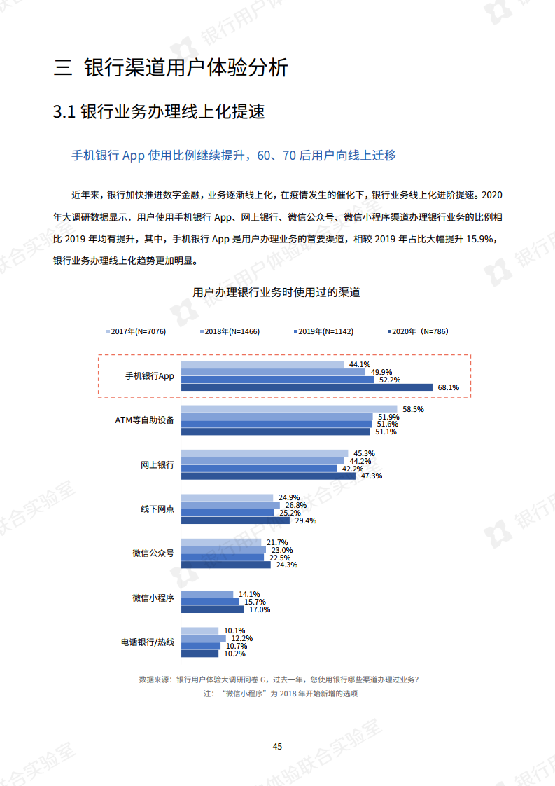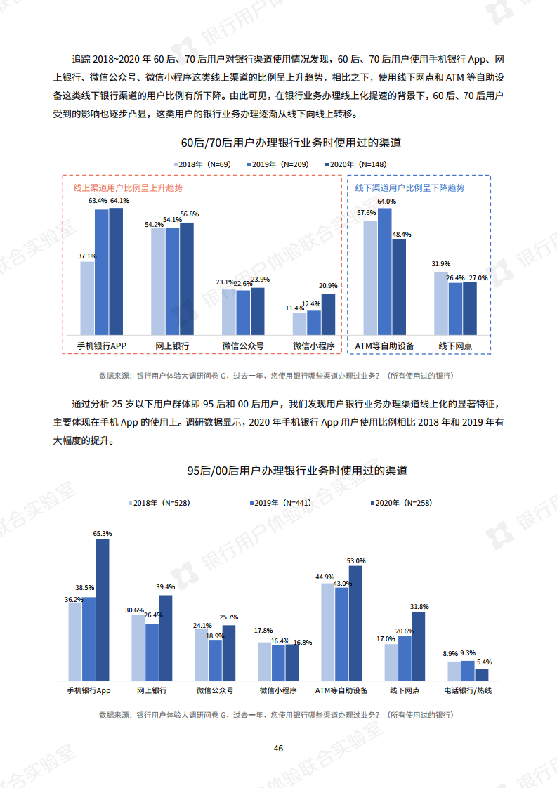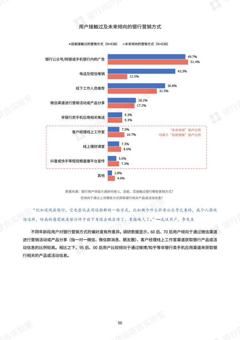 疫情的发生使银行大力倡导非接触式服务,银行业今年最明显的特点是“线上化加速,银行试水新营销模式”。调查显示,手机银行APP已成为银行服务“主战场”,通过手机银行App办理业务的用户与去年相比,提升了15.9%。此外,今年银行还开展了线上的新营销方式,比如客户经理线上工作室,线上课堂或短视频推广,用户对这些新营销方式接受度较高。报告指出“以短视频为代表的新营销方式,有助于转变用户对银行的刻板印象。”