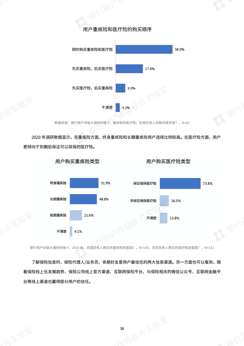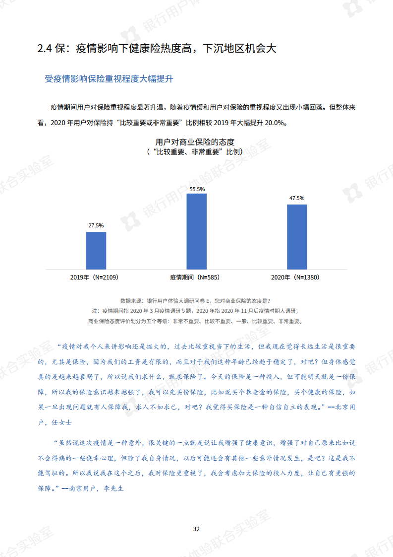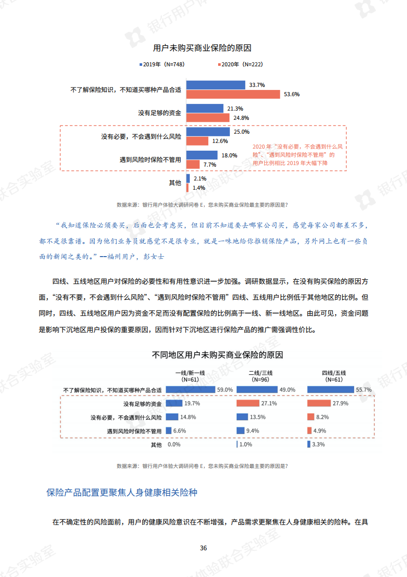 经历过疫情的考验,公众对健康的更加关注。用户的保险意识增强,对保险的重视程度大幅提升,调查报告显示,今年用户更重视人身健康相关险种,其中重疾险首次超过意外险,成为用户最重视的险种,除此之外,住院医疗险、专病专享医疗险、门急诊医疗险的配置意愿也较强。