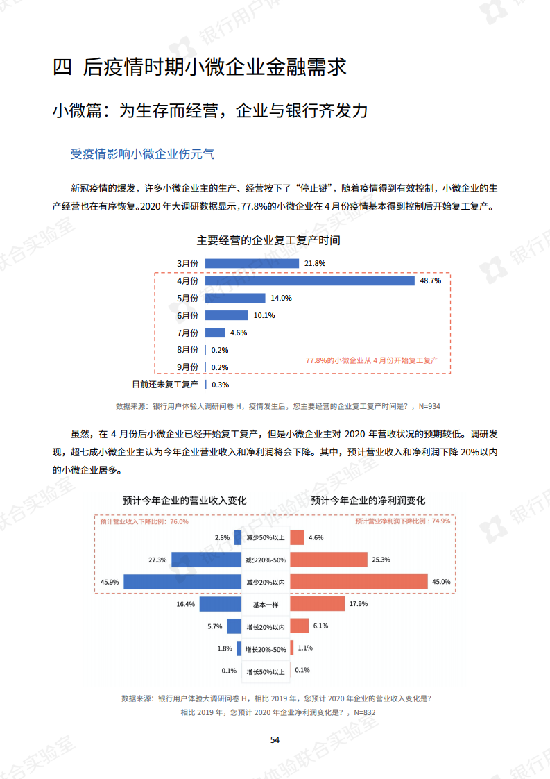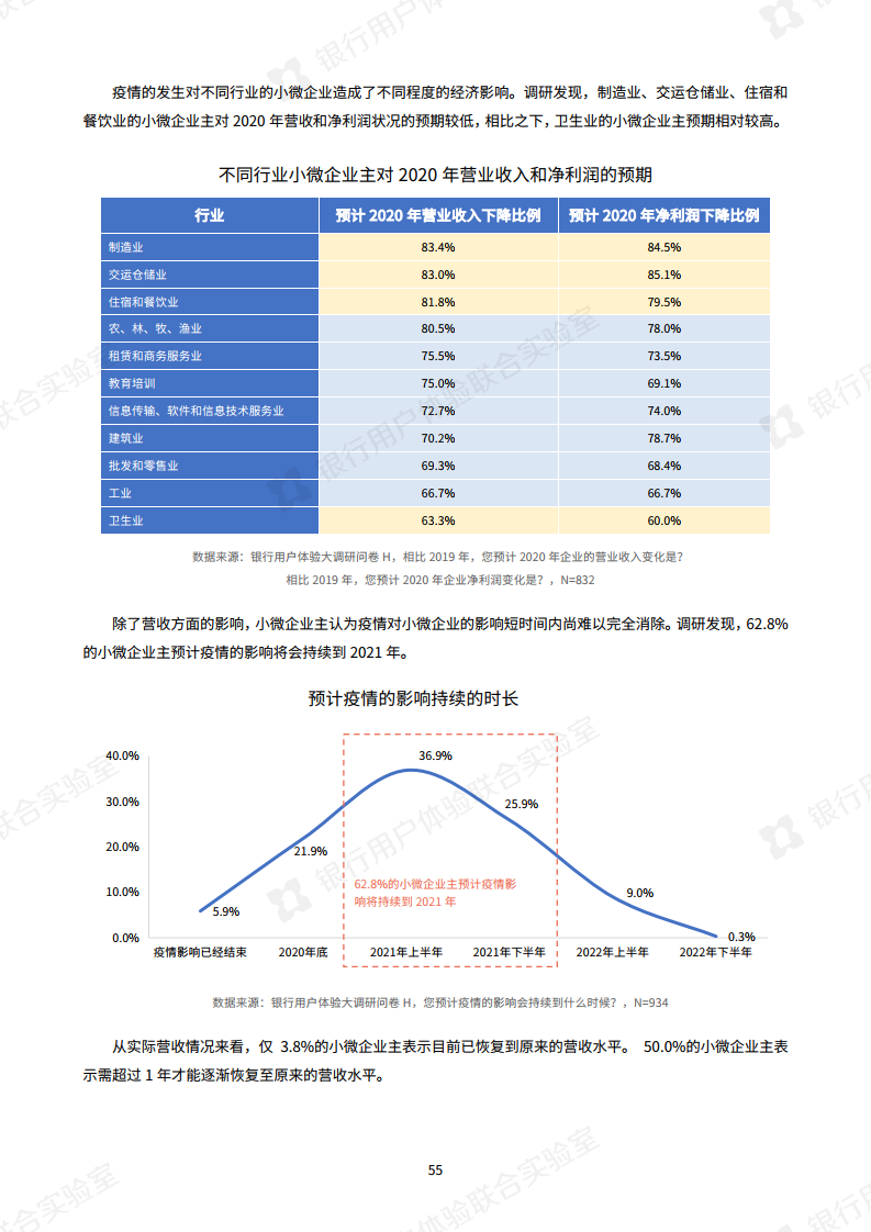 2019年,78.9%的小微企业主预计营收上升,而2020年,76.0%的小微企业主预计营收下降。调查显示,对2020年的营收状况,小微企业主的预期较低:超七成小微企业主认为,今年企业的营收和净利润将会下降。62.8%的小微企业主预计疫情的影响将会持续到2021年。