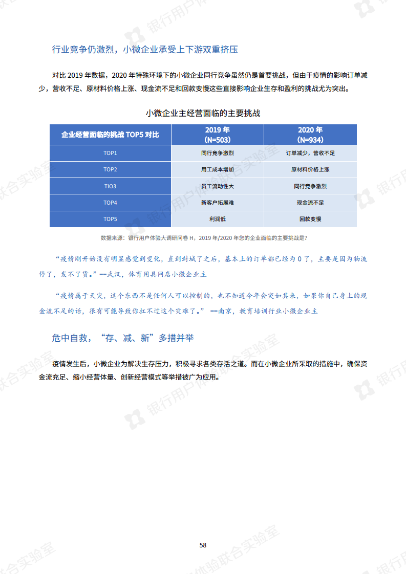 疫情让大多数小微企业主对经营的看法从“2019年的谋发展”,变为“求生存”。相较于2019年“同行竞争是企业经营面临的最大挑战”,今年小微企业面临的是“订单减少、营收不足、原材料价格上涨、现金流不足和回款变慢”等直接影响企业生存和盈利的挑战。