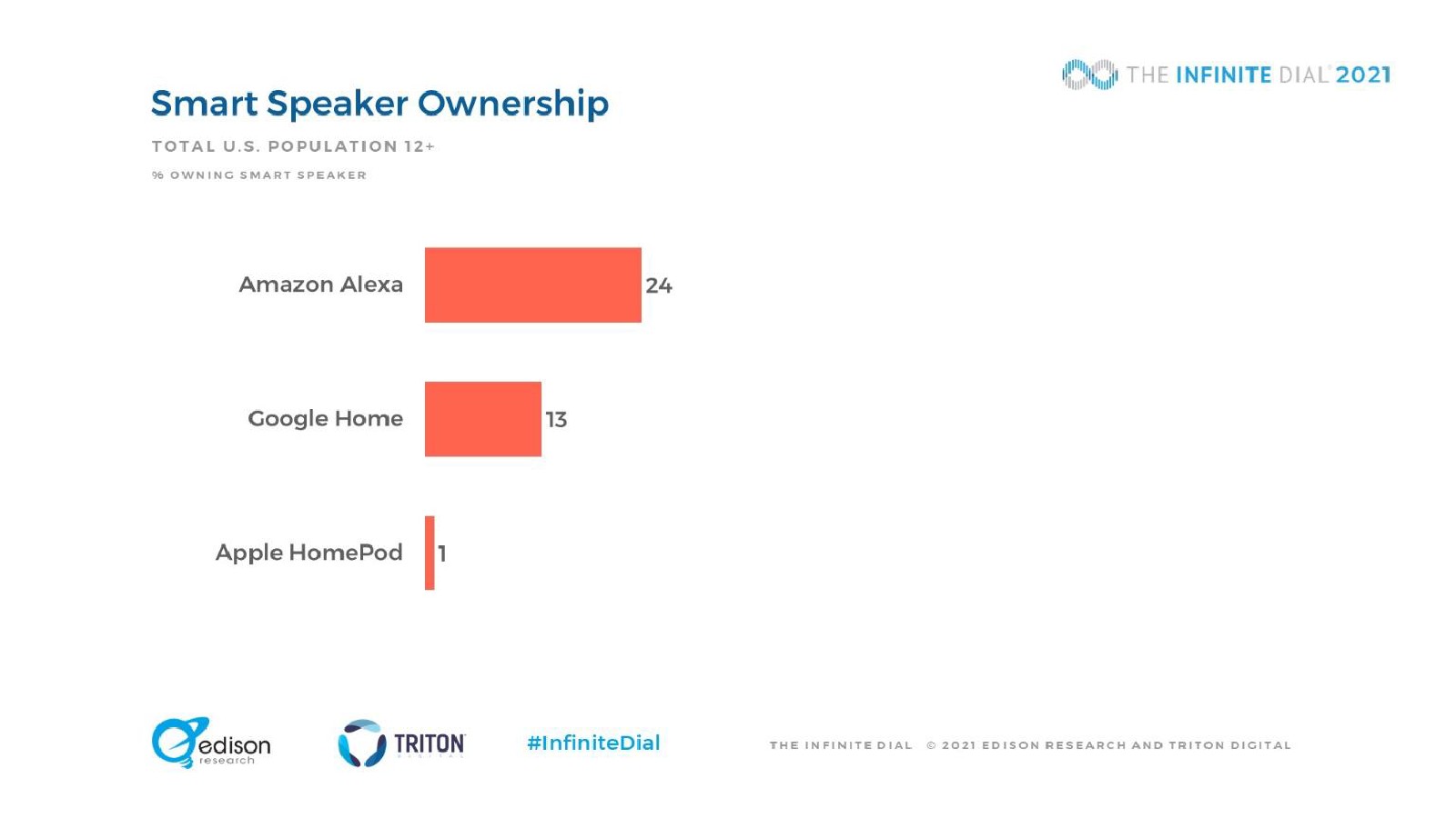 1/3的12岁以上美国人(33%,约9400万人)现在拥有智能音箱,比去年增长22%,是2017年(7%)的近5倍。在拥有智能音箱的人中有34%家里有三台或三台以上的智能音箱。