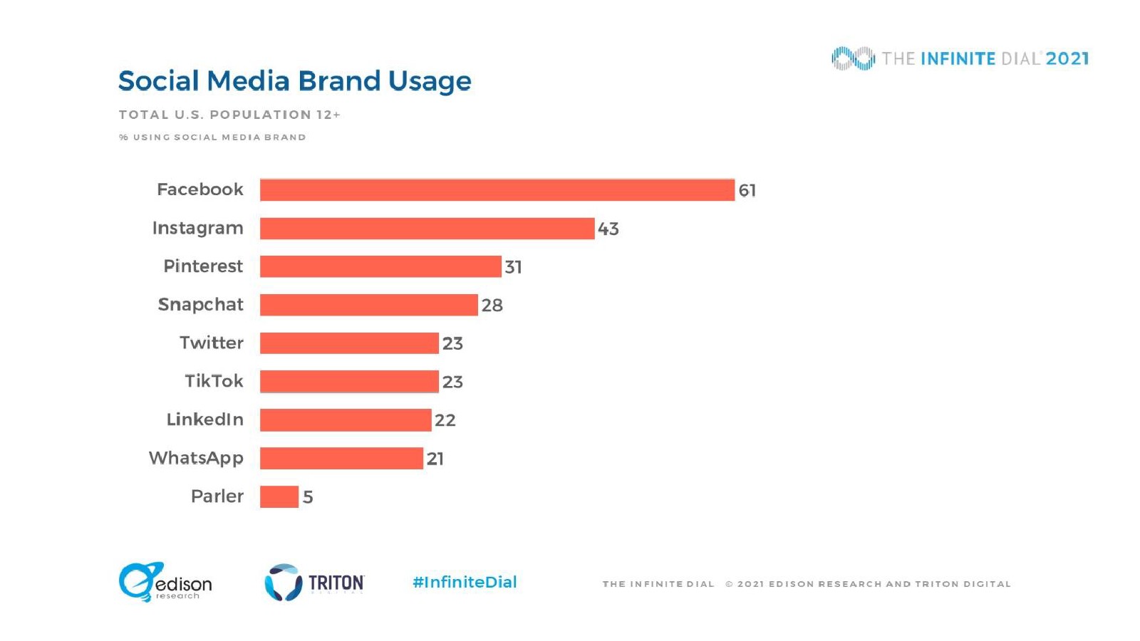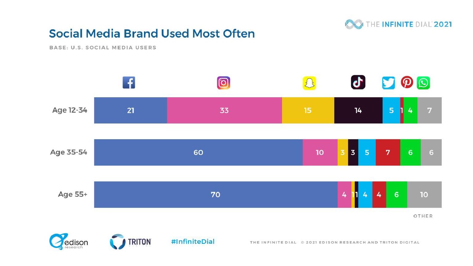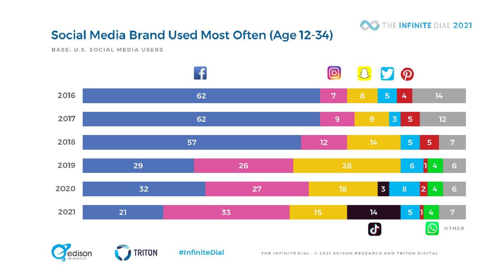 88%的12岁以上美国人拥有智能手机,比去年的85%有了新的增长。平板电脑(51%)和智能手表(18%)的普及已经趋于平稳,这意味着智能手机是迄今为止最受欢迎的媒体消费设备。TikTok的使用量激增,尤其是在12-34岁之间。在青少年中有44%正在使用这项服务,比去年的25%有所上升,增幅为76%。Facebook首次不再是大多数社交媒体用户最常使用的社交媒体品牌,47%的美国人将Facebook作为最常使用的平台(低于前年的54%和2016年的62%)。1/5的12岁以上美国人观看过视频游戏直播,10%的人播放自己的游戏。51%的受访者“经常”或“有时”与他人一起听音频,12-34岁的美国人中这一比例上升到69%。18岁以上美国人中上个月开车或驾车的比例从2020年的87%下降到今年的83%。