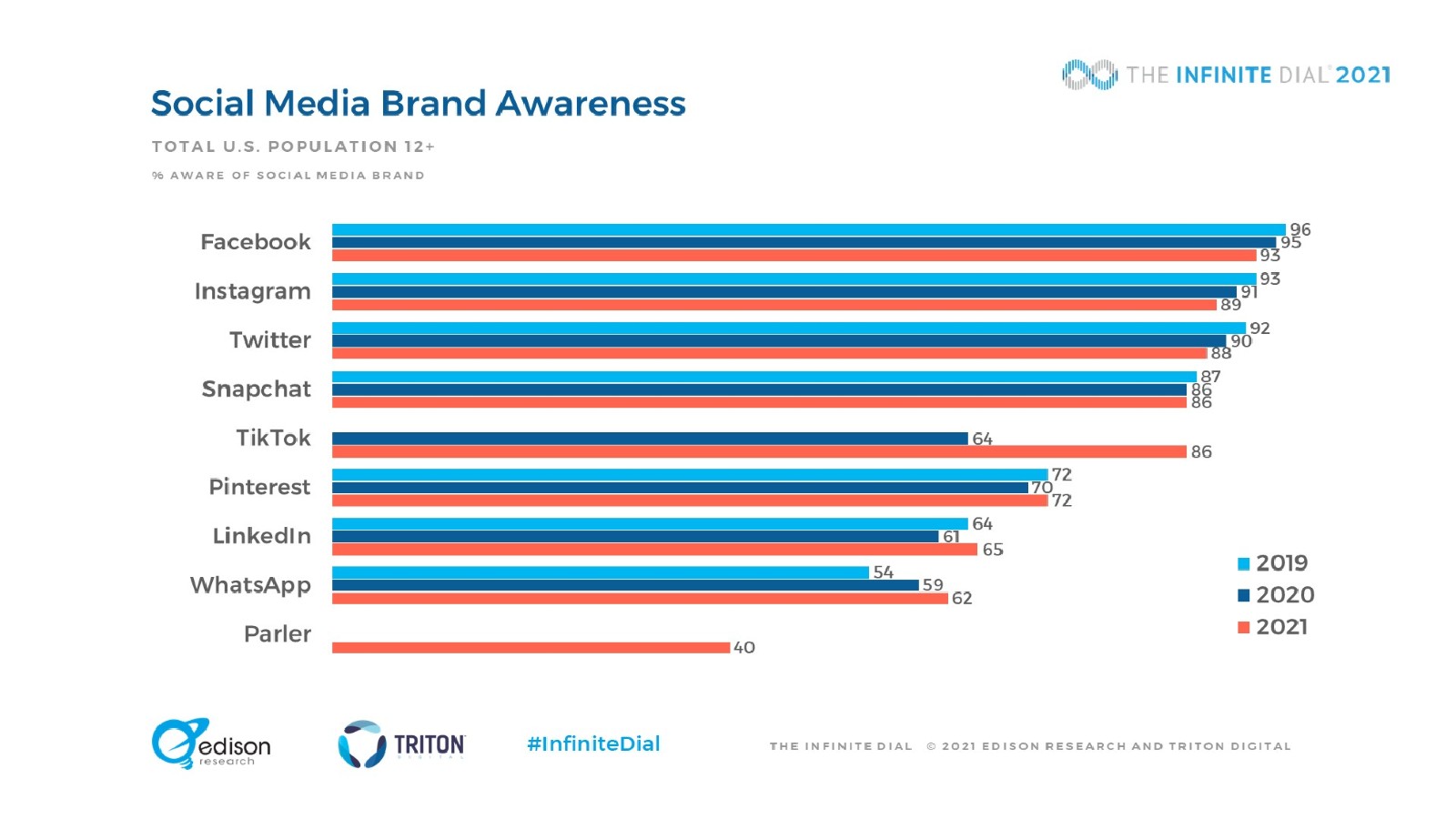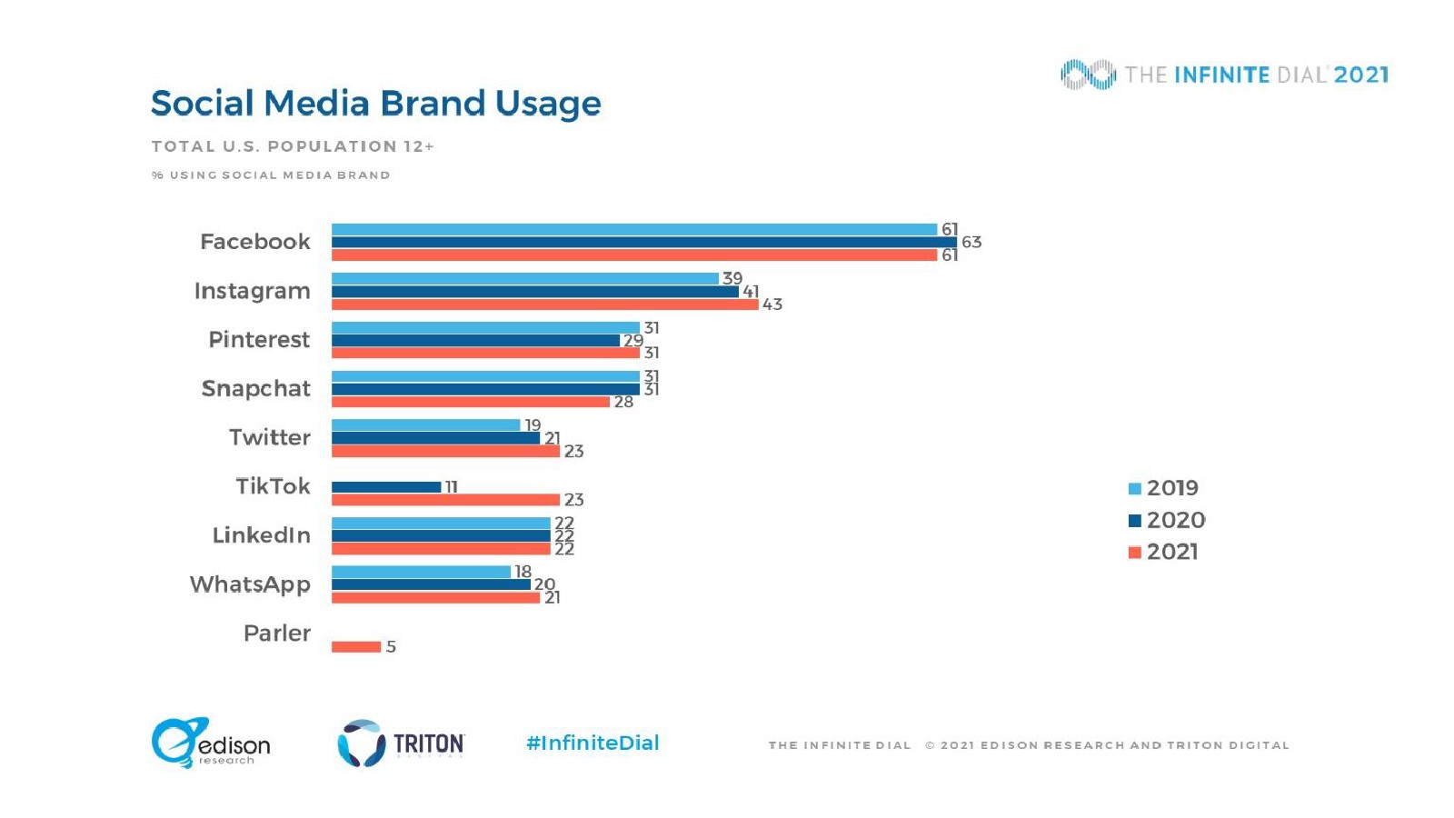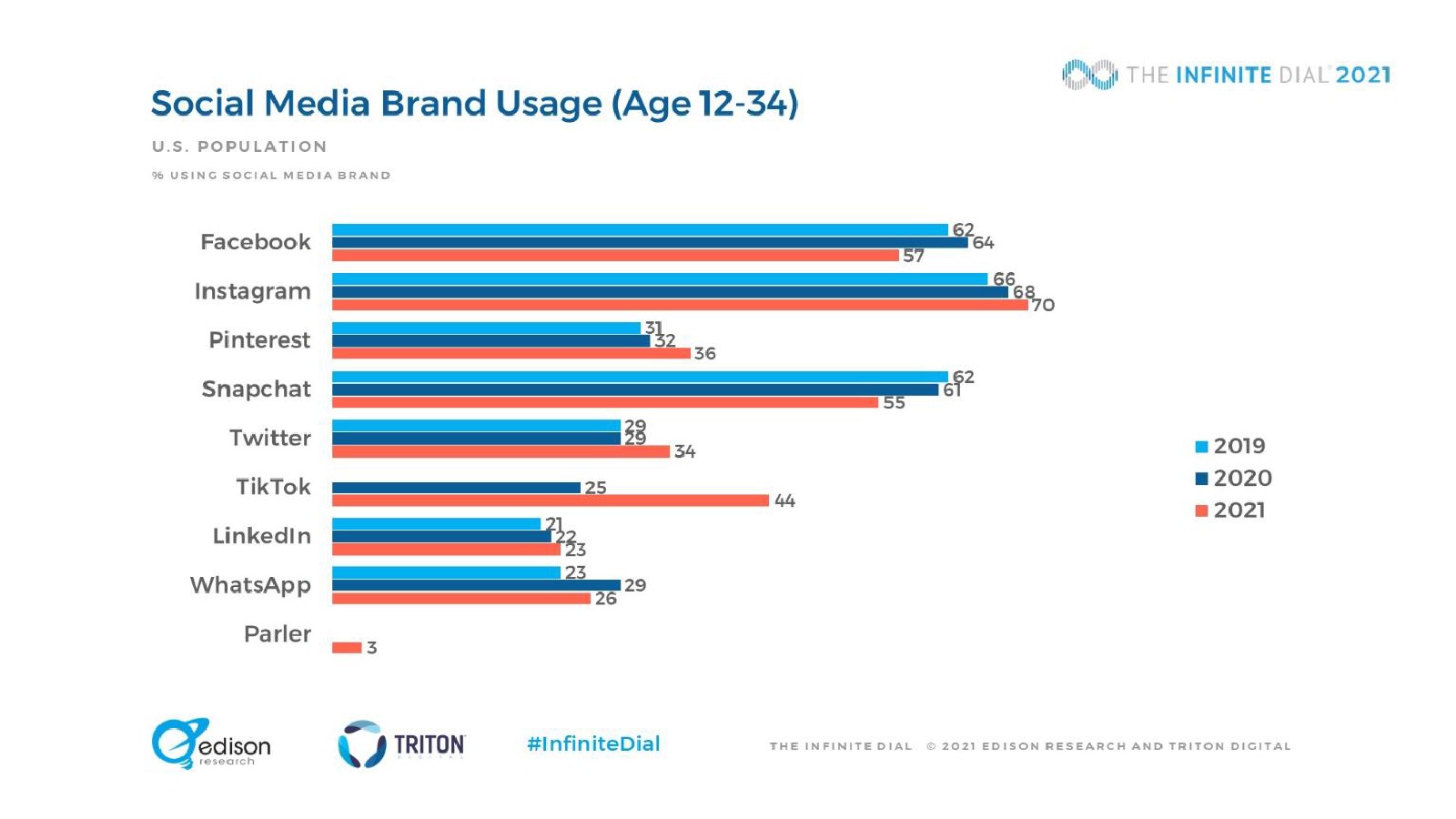 88%的12岁以上美国人拥有智能手机,比去年的85%有了新的增长。平板电脑(51%)和智能手表(18%)的普及已经趋于平稳,这意味着智能手机是迄今为止最受欢迎的媒体消费设备。TikTok的使用量激增,尤其是在12-34岁之间。在青少年中有44%正在使用这项服务,比去年的25%有所上升,增幅为76%。Facebook首次不再是大多数社交媒体用户最常使用的社交媒体品牌,47%的美国人将Facebook作为最常使用的平台(低于前年的54%和2016年的62%)。1/5的12岁以上美国人观看过视频游戏直播,10%的人播放自己的游戏。51%的受访者“经常”或“有时”与他人一起听音频,12-34岁的美国人中这一比例上升到69%。18岁以上美国人中上个月开车或驾车的比例从2020年的87%下降到今年的83%。