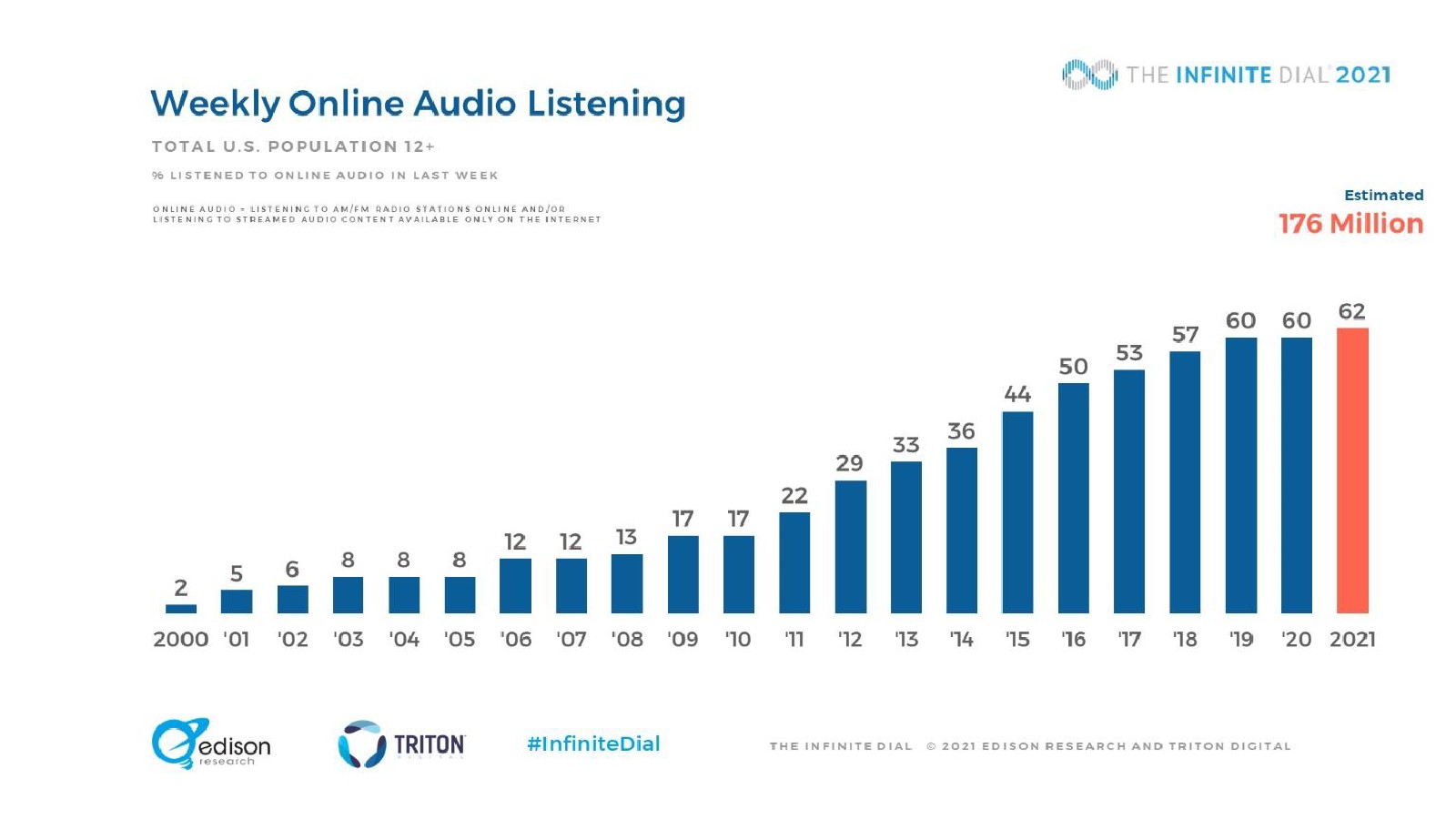 美国12岁以上人口中有62%现在每周在线收听音频,约1.76亿人,这一比例创下历史新高。