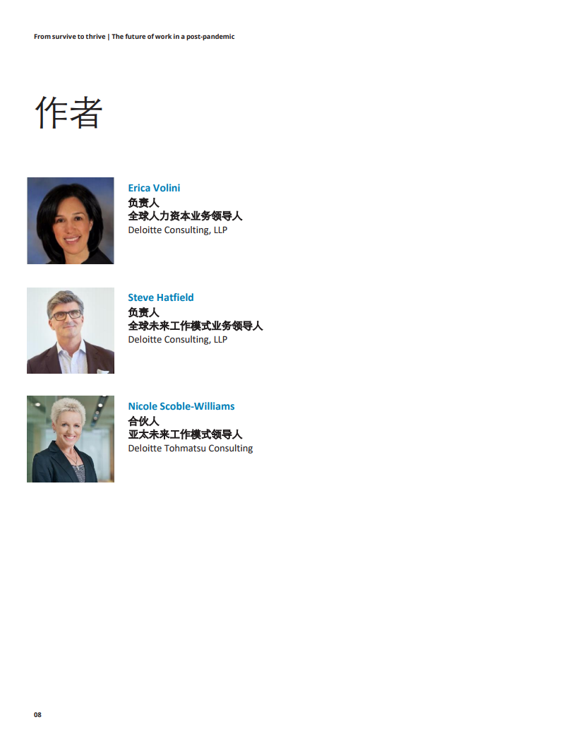 重构工作:把握当前时机,定义新的未来工作愿景与目标成果,专注于探究“可能的艺术”,利用技术开发并提升人的能力。释放员工潜能:企业须转变对于劳动力的固有认知,并采用技术助力,在企业内外部识别人才,释放潜能。提升工作场所适应力:更广义的工作环境包括实体与线上工作场所构成的生态系统,以及预期的人际协作、参与和互动方式,其中,所需的组织和文化变革不容忽视。“等待更好时机”的心态并不可取。着手构建以人为本的未来工作模式,如今正当其时。