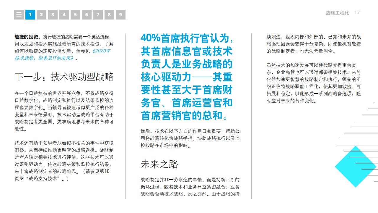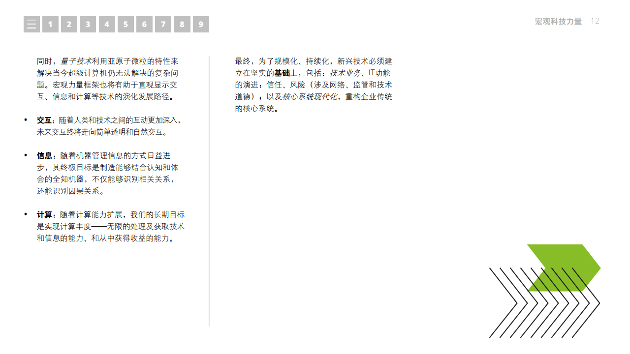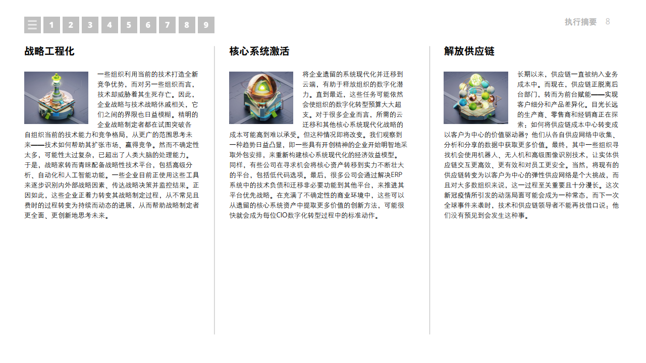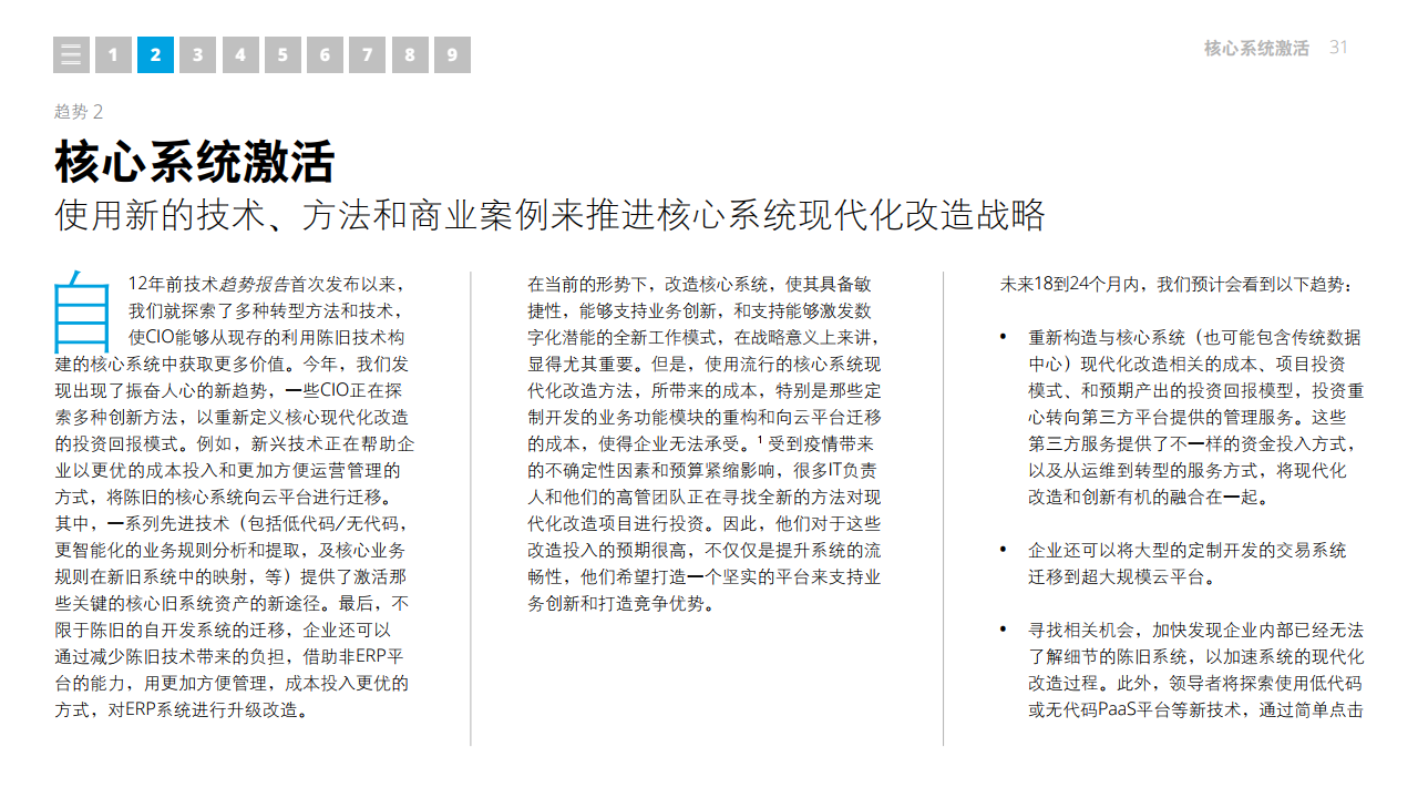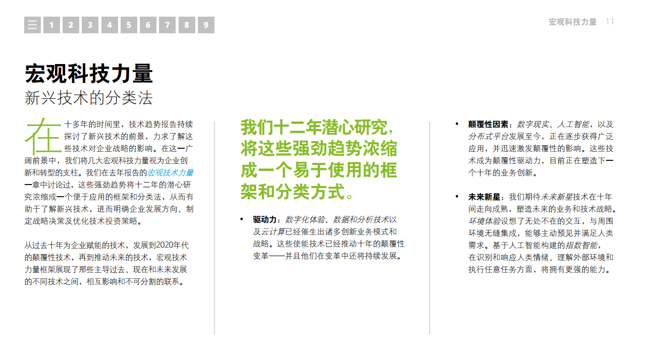 《报告》表明,全球企业均在加速数字化转型,不仅是为了运营更加灵活、高效,更主要地是为了应对市场需求和客户期望的剧烈波动。德勤管理咨询观察到的技术趋势包括未来的工作环境、人工智能产业化、关键核心业务的升级以及支持多样性、公平性和包容性的技术等九个趋势,分为三大类: