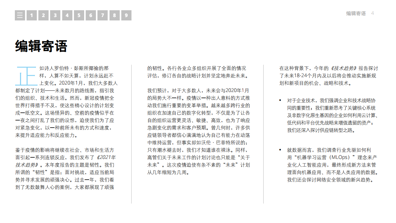 三、 数据:无所不能的艺术:当企业进一步迈向自动化和机器主导决策,人的能力将显著倍增。MLOps:产业化人工智能 ;机器数据革命:专供机器的数据,以及零信任:从不相信,永远验证,介绍了企业通过工业化和自动化实现更多价值的三个机会。