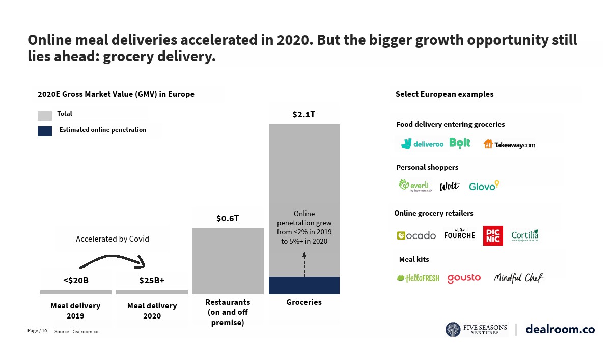 食品电子商务市场的总价值为2.1万亿美元,相比之下,送餐业总价值为0.6万亿美元。因此,食品杂货市场的规模远大于食品配送市场。食品电子商务公司在2020年实现了飞速增长。