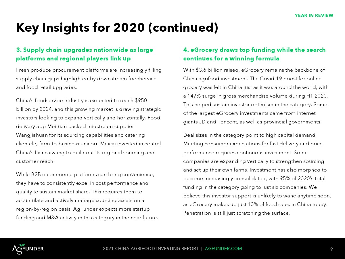 AgFunder发布了“2021年中国农产品投资报告”。与2019年相比,全球普通私募股权和风险投资水平下降了50%,而在中国投资的农产品初创企业增长了66.1%,全球农产品投资增长34.5%。