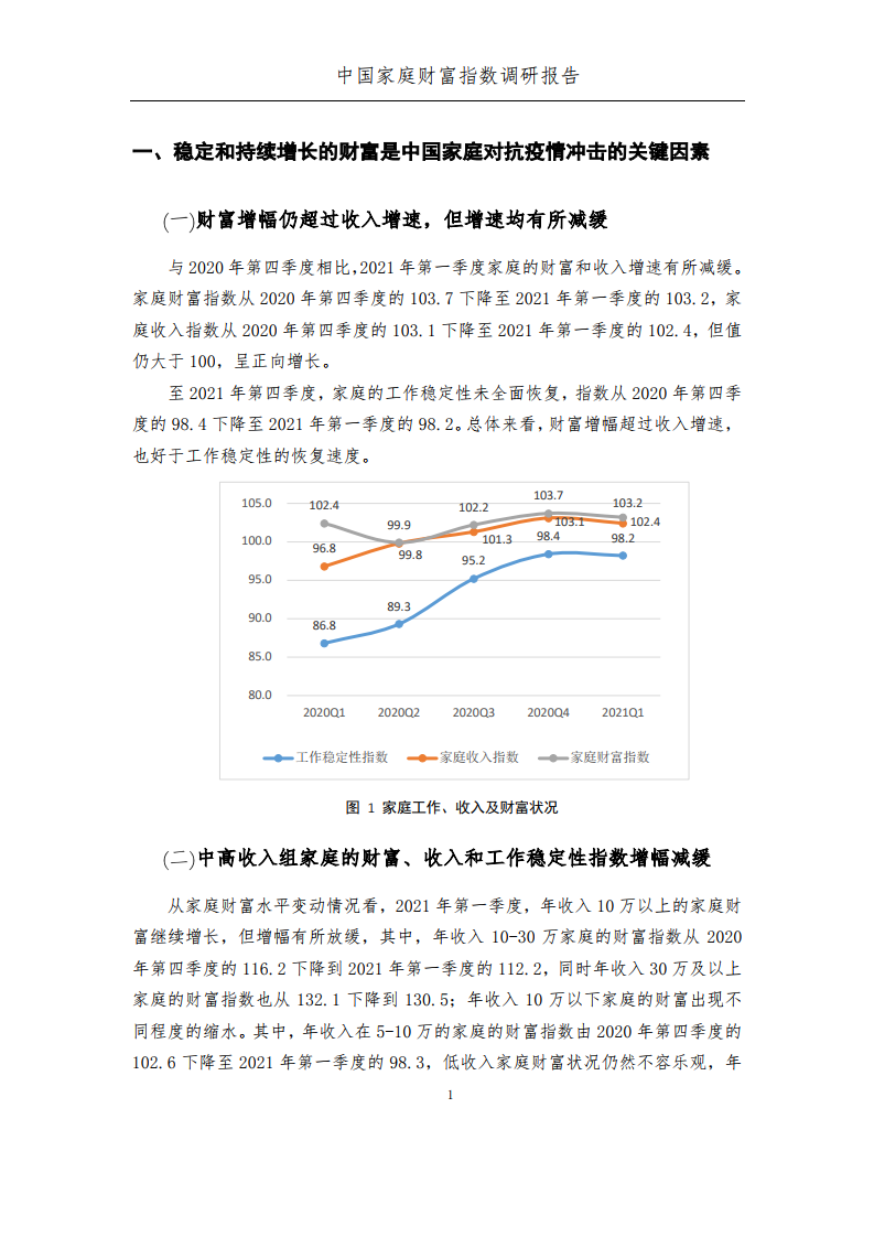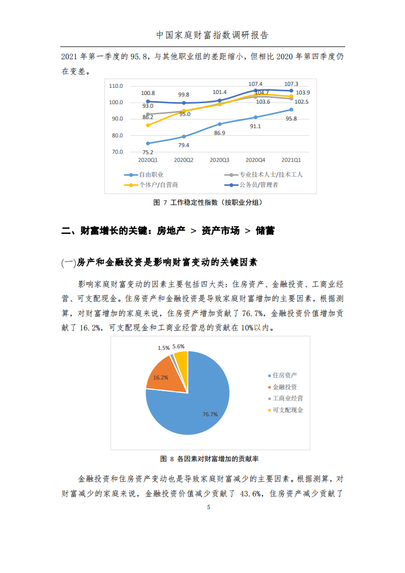 报告发现,首先,2021年第一季度,家庭财富、收入及工作稳定性总体表现均为平稳,其中财富增速仍超过收入增速,但两者增速均有所减缓。从收入分组看,主要是中高收入组家庭的财富、收入和工作稳定性增幅减缓。从职业分组看,自由职业群体的表现仍是相对较差的,但工作稳定性与其他职业组的差距有所缩小。从复工群体的复产情况看,工作量不及去年同期水平的群体占比有所降低。
