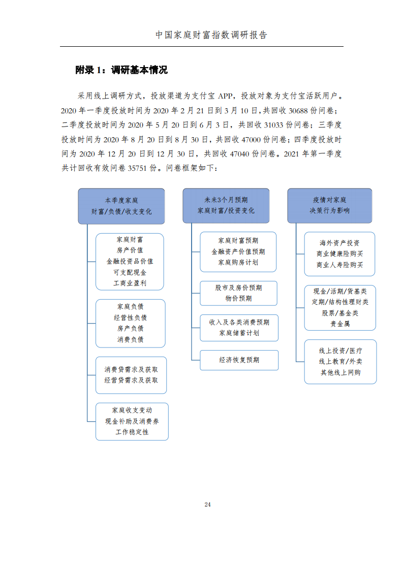 其次,家庭各类资产配置更加均衡。经历了2020年初疫情,家庭商业保险类、存款类配置意愿从2020年最开始的高涨逐渐回落至2021年的配置常态化。2021年第一季度均衡化配置的家庭占比略有上升,表明更多家庭参与到均衡化配置中。同时,家庭的线上投资意愿在2021年第一季度继续提升,年轻、高资产及一线城市家庭的线上投资增幅相对最高,老年、低资产及非一线城市家庭的线上投资也是增加的,但相比上述群体仍存在一定差距。
