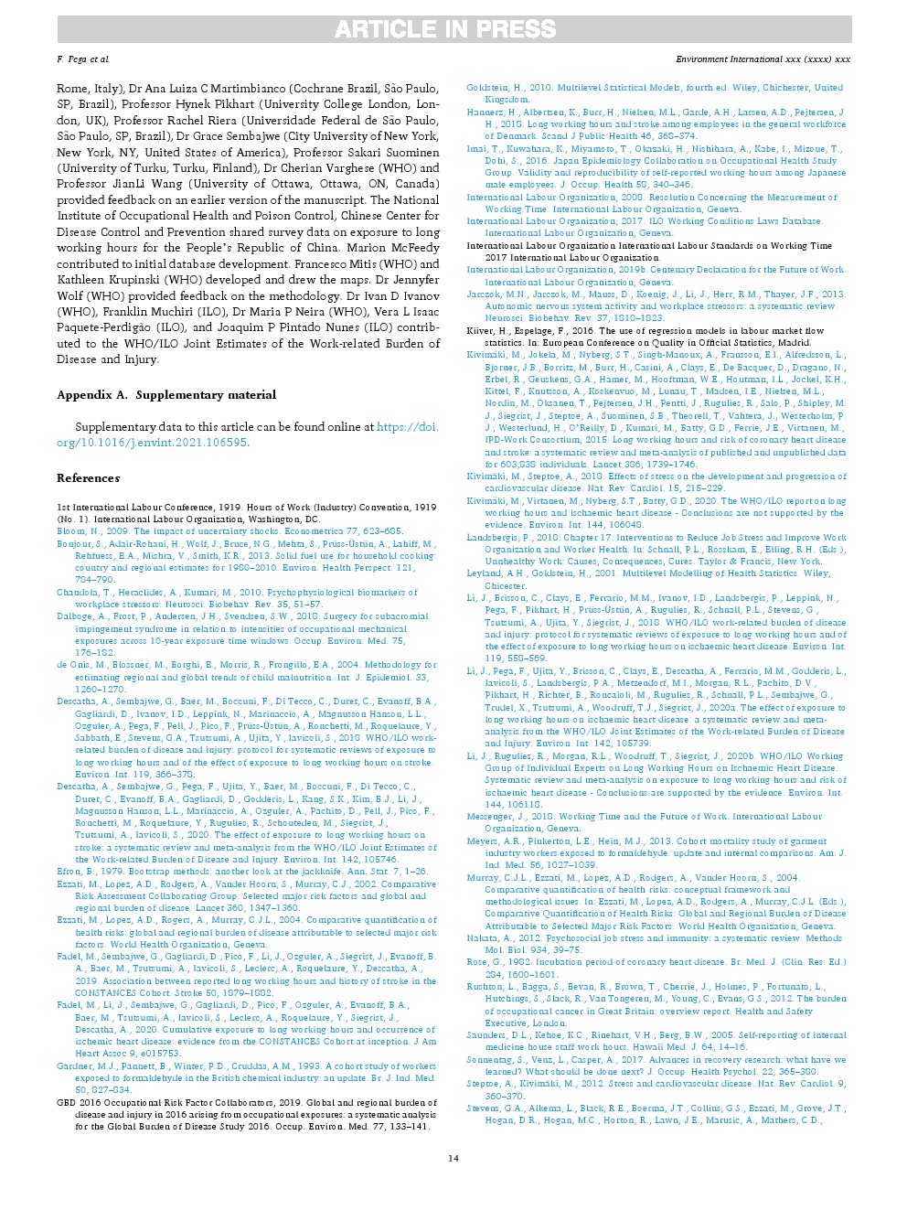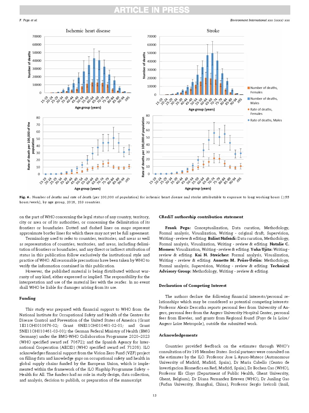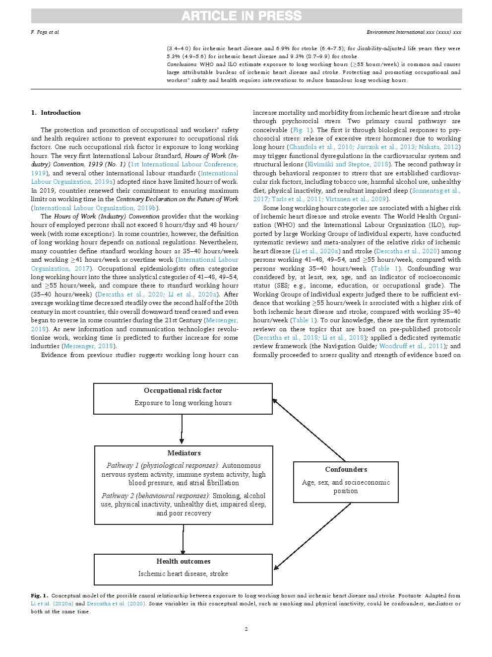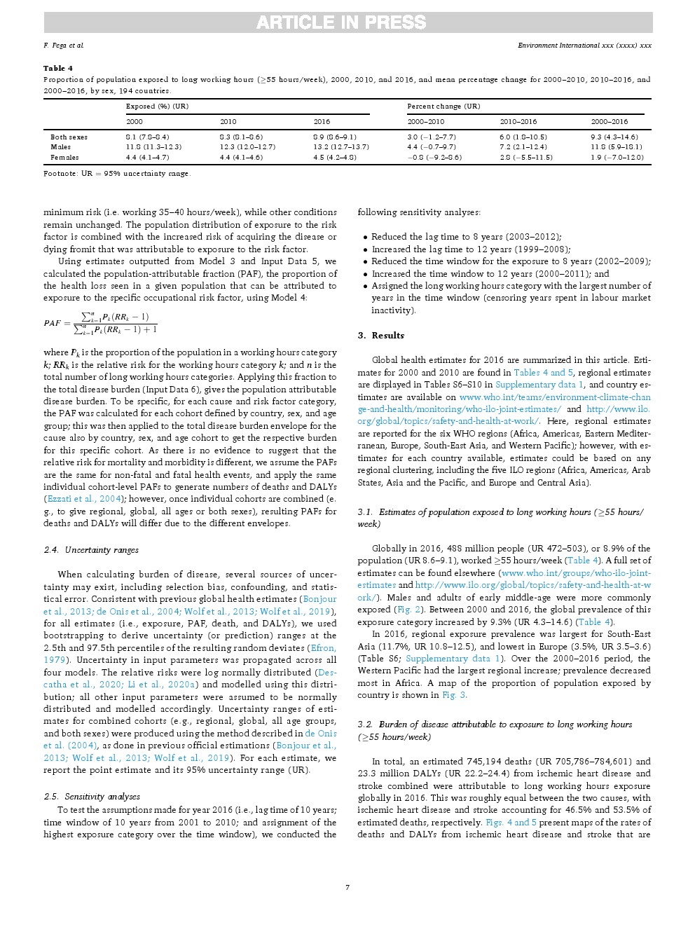 世卫组织和国际劳工组织首次对长时间工作造成的生命和健康损失进行了全球分析。2016年,由于每周至少工作55小时,有39.8万人死于中风,34.7万人死于心脏病。2000年至2016年间,因长时间工作导致的心脏病死亡人数增长了42%,中风死亡人数增长了19%。