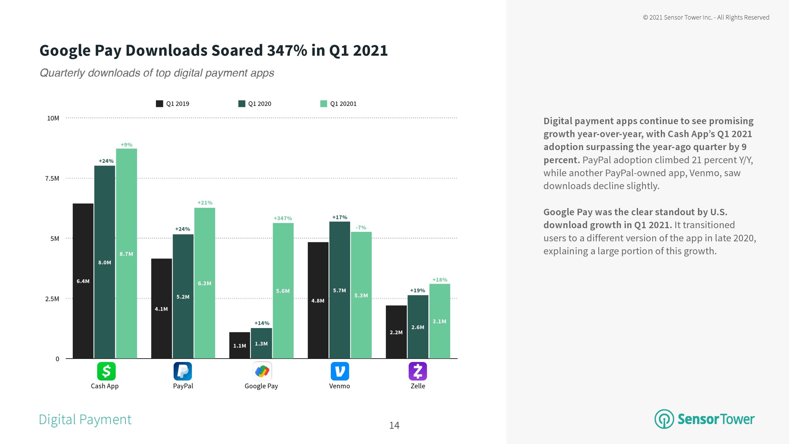 SensorTower发布了“2021年支付应用报告”,持续的新冠大流行导致去年支付和转账应用程序在美国的普及率达到创纪录水平。2021年初,这一领域仍在不断增长。报告深入探讨了移动支付市场的发展趋势,以及对顶级支付应用。